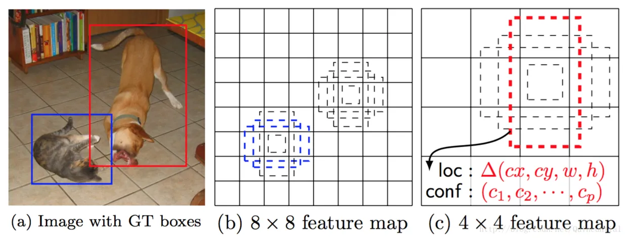 图1:SSD框架。(a)在训练期间,SSD仅需要每个目标的输入图像和真实边界框。以卷积方式,我们在具有不同尺度的若干特征图中的每个位置处评估不同横款比的默认框小集合(例如4个)。对于每个默认边界框,我们预测所有目标类别((c1,c2,…,cp)(c1,c2,…,cp))的形状偏移量和置信度。在训练时,我们首先将这些默认边界框与实际的边界框进行匹配。例如,我们已经与猫匹配两个默认边界框,与狗匹配了一个,这些框视为正样本,其余的视为负样本。模型损失是定位损失(例如,Smooth L1[6])和置信度损失(例如Softmax)之间的加权和。