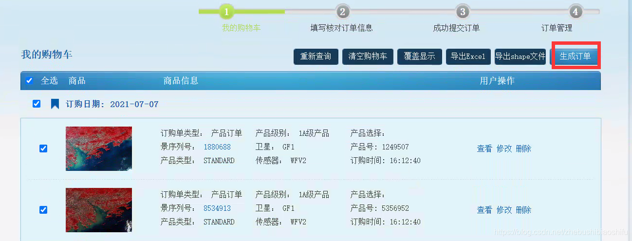 可以通过“贴图”查看每一景图像的具体情况。找到合适的一张或多张遥感影像后,对其加以勾选,并点击上方的“立即订购”。
