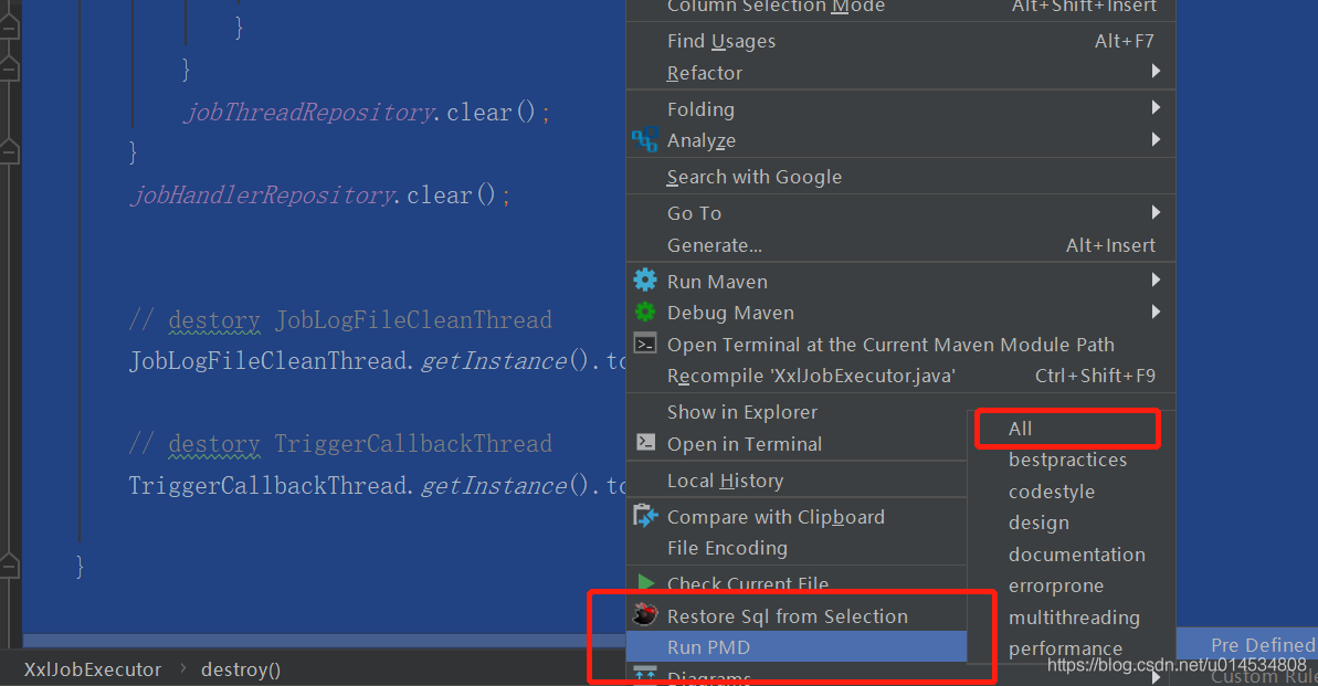 选中一段代码,然后右键Run PMD->Pre Defined,这里有许多检查类型可以选择,有代码样式,设计等等。