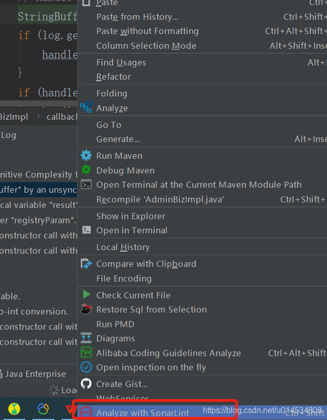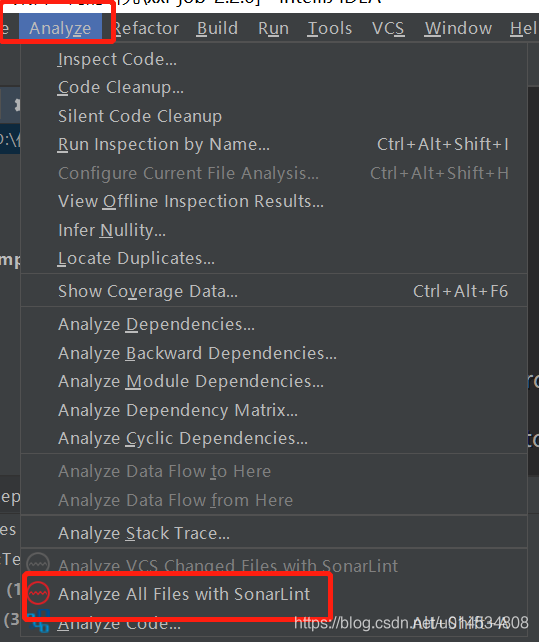 配置好SonarList之后,就是使用了,SonarLint既可以对所有文件进行检查,检查全部文件的方式是:点击Analyze->Analyze All Files with SonarLint。