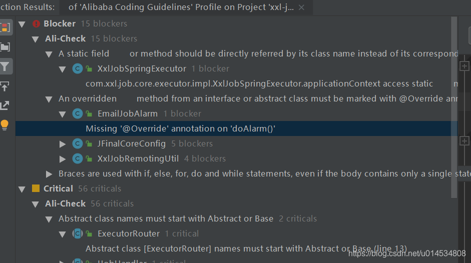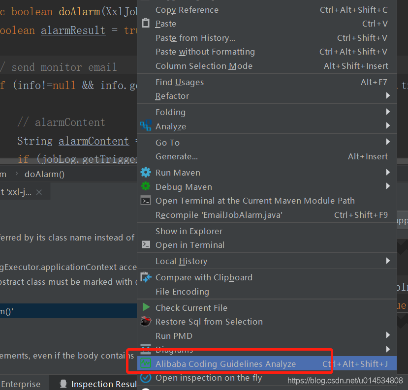 如果要对单个的文件进行检查的话,可以在类上右键,选中Alibaba Coding Guidelines Analyze