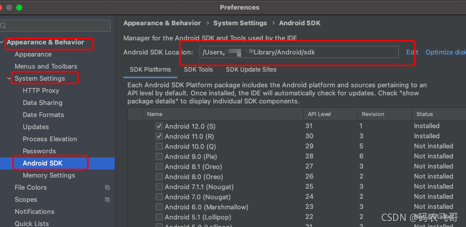 是/Users/xiaowei/Library/Android/sdk。这里安装的SDK的版本是最新的Android 12.0 版本。