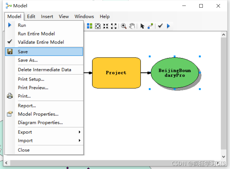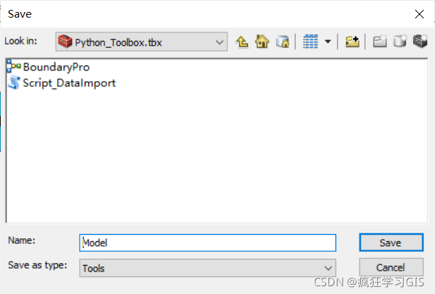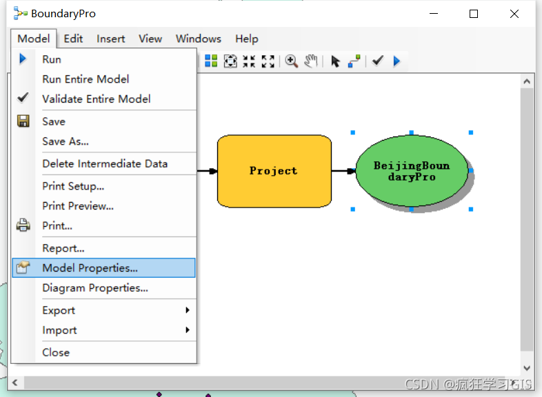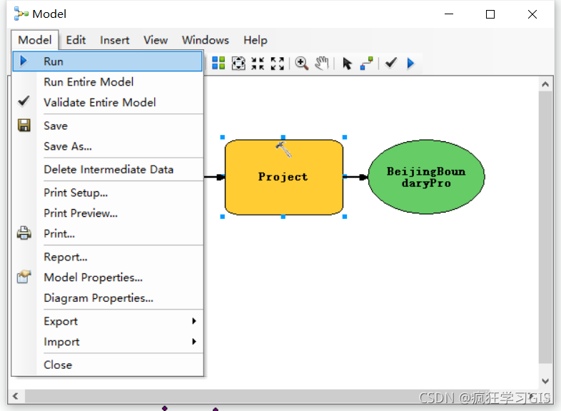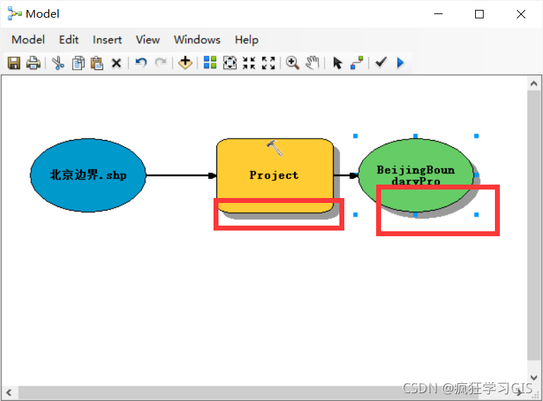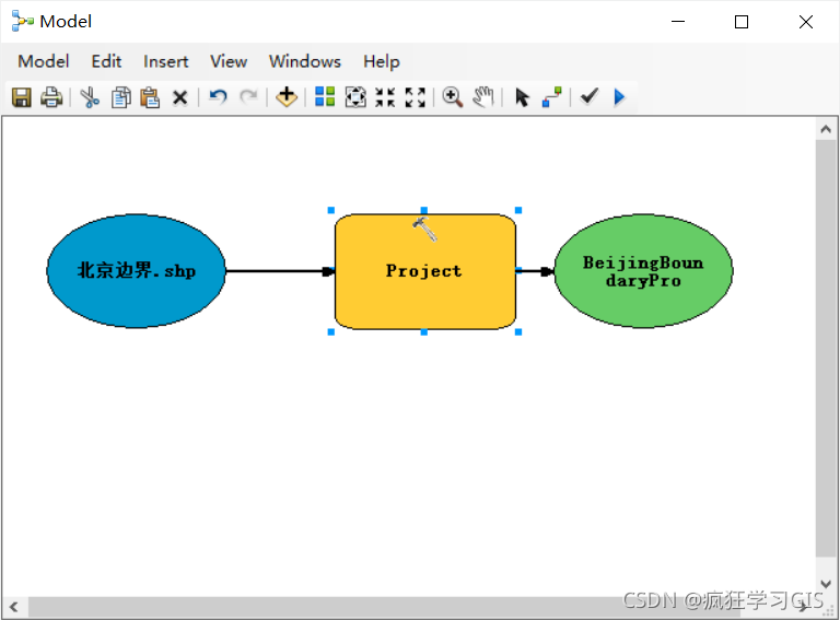 接下来,我们导入前文提及的第二种素材——模型具体的操作工具。导入工具有两种方法:如果要导入的工具是ArcGIS自身已有的工具,那么我们可以直接将其从“Catalog”窗口中拖动到“Model”窗口中;而如果该工具是类似于ArcGIS将Python代码脚本创建为工具箱、自定义工具(https://developer.aliyun.com/article/1151096)中提及的自定义工具,那么我们可以通过前文提到的“Insert”→“Add Data or Tool...”方法来导入。