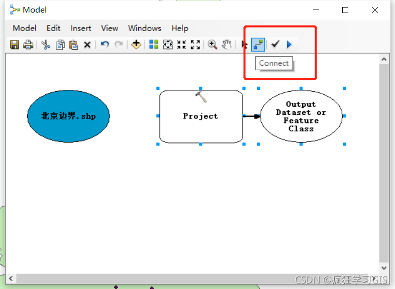 此时可以看到,初始数据与工具之间并没有建立连接;因此我们选择“Connect”功能,用鼠标将二者连接起来。