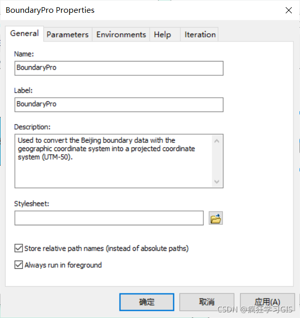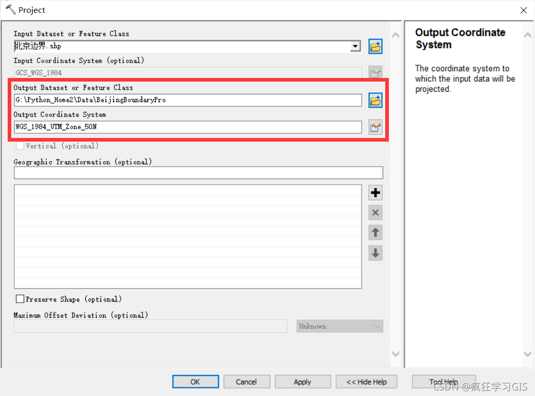 可以看到,这里其实就是我们一般用ArcGIS下属各类工具时的参数窗口;而由于我们已经给模型设定了初始数据,因此其第一项参数是默认的。我们对输出数据路径及投影坐标系加以选择即可。