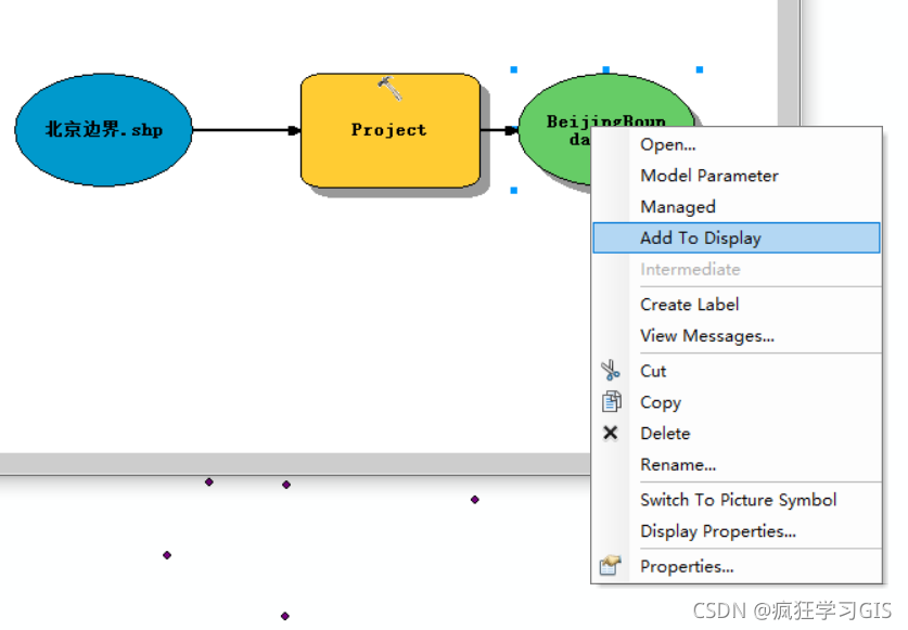 在输出结果数据上右键,选择“Add To Display”,即可将该数据图层显示在ArcMap中。但这个功能似乎不太稳定,我的电脑上点这个按钮,不知道为什么图层并不会显示。