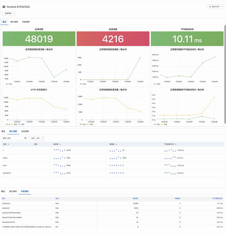 基于 eBPF 技术,SAE 应用监控支持了针对任意语言,任意框架的无入侵指标采集与监控告警能力,提供包括应用/实例维度的黄金三指标 RED(请求数,错误数,响应时间)和 HTTP 状态码统计,以及提供服务与依赖服务的接口级别调用信息。借助内置可视化大盘,开发运维人员可以及时评估当前应用对外服务状态,有效识别用户体验、服务中断、业务异常等问题。