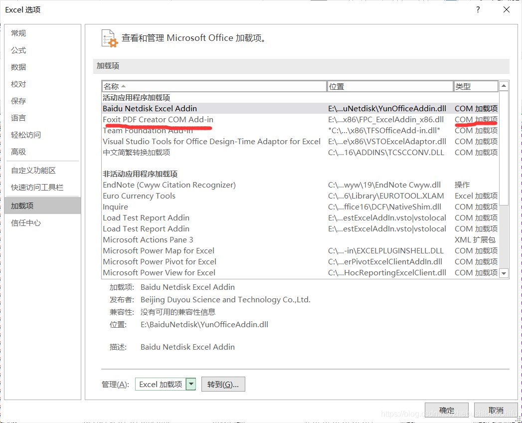 发现是上述一个PDF编辑器插件使得Excel打开速度变得缓慢。将这个加载项的名称记下来。但是这里需要注意,如果大家在Excel文件中经常使用这一加载项,就不要继续进行后续的操作了,否则后期Excel中这一加载项的功能将无法使用。