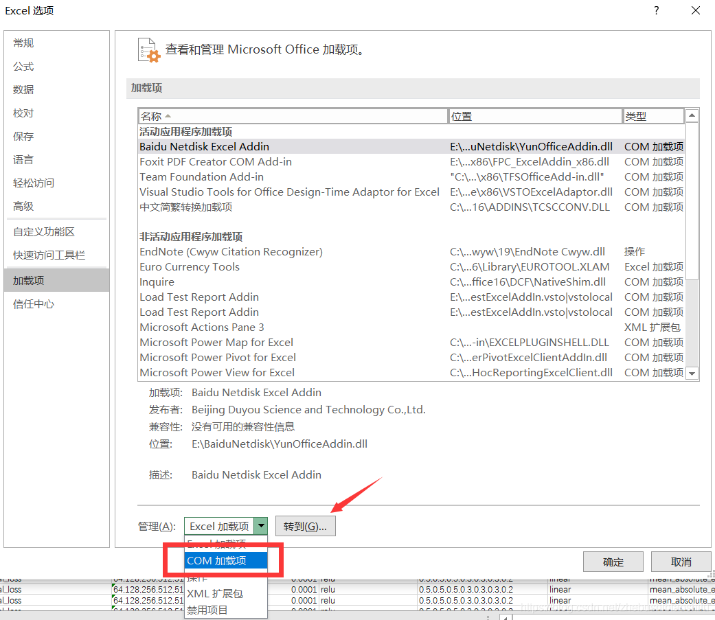在下方“管理”处选择上述对应的类型,在这里就是“COM加载项”;点击“转到”。