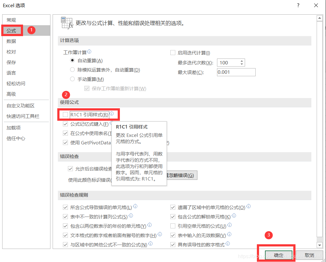 随后,点击选择“公式”,并勾选“R1C1引用样式”,然后点击“确定”即可。