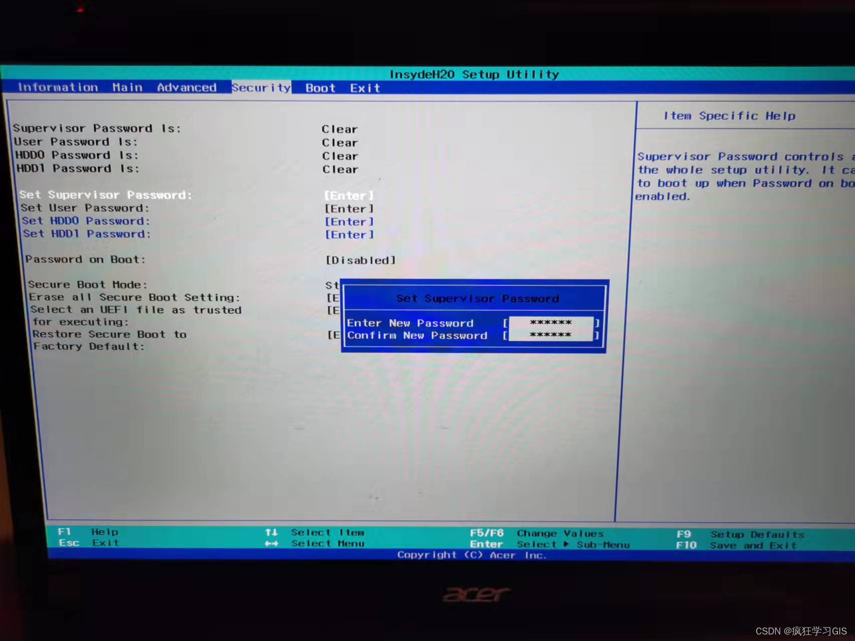 进入BIOS模式后,一般是要找到“Security”或者类似的界面并进入;随后,找到“Set Supervisor Password”这一选项。这里需要注意,由于大家的电脑品牌、型号等都不相同,因此具体的选项名称可能都不一样,但是肯定选项名称的含义都是差不多的;大家依据实际情况来找即可。