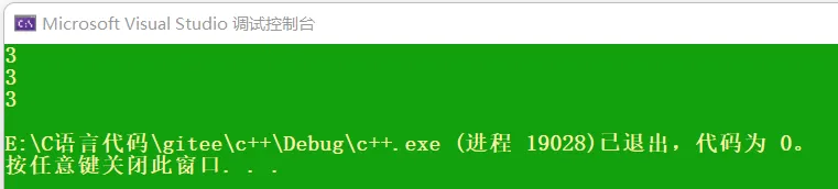 1. #include<iostream> 2. using namespace std; 3. 4. class A 5. { 6. public: 7. A()//构造函数 8. { 9. ++_n; 10. } 11. 12. A(const A& a)//拷贝构造函数 13. { 14. ++_n; 15. } 16. 17. //private: 18. static int _n;//n存在于静态区,属于整个类,不属于某个对象 19. }; 20. 21. int A::_n = 0; 22. 23. int main() 24. { 25. A a1; 26. A a2; 27. A(); 28. 29. //这三行访问的都是全局的_n,因此打印结果都一样 30. cout << A::_n << endl;//类名::静态成员变量 31. cout << a1._n << endl;//对象.静态成员变量 32. cout << a2._n << endl;//对象.静态成员变量 33. }