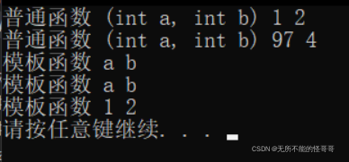 1. #include <iostream> 2. using namespace std; 3. 4. template<typename T> 5. void my_print(T a, T b) 6. { 7. cout << "模板函数 " << a << " " << b << endl; 8. } 9. 10. void my_print(int a, int b) 11. { 12. cout << "普通函数 (int a, int b) " << a << " " << b << endl; 13. } 14. 15. void my_print(int a, char b) 16. { 17. cout << "普通函数 (int a, char b) " << a << " " << b << endl; 18. } 19. 20. int main() 21. { 22. my_print(1, 2); //优先匹配普通函数 23. 24. my_print('a', 4); //调用 my_print(int a, int b) 并会自动进行类型转换,把 'a' 转换为 int 型 25. 26. my_print('a', 'b'); //调用模板函数,模板函数严格进行参数类型匹配,并会自动推导参数类型 27. //只有调用时两个参数类型完全一致且没有普通函数匹配的时候才会调用模板函数(参数更佳匹配) 28. 29. my_print<char>('a', 'b'); //显式参数类型 30. 31. my_print<>(1, 2); //强制使用模板函数,不会在调用 my_print(int a, int b) 32. 33. //my_print<>(1, 'a'); //错误 C2672 “my_print” : 未找到匹配的重载函数 34. //函数模板不会进行参数类型转换 35. 36. 37. system("pause"); 38. return 0; 39. }