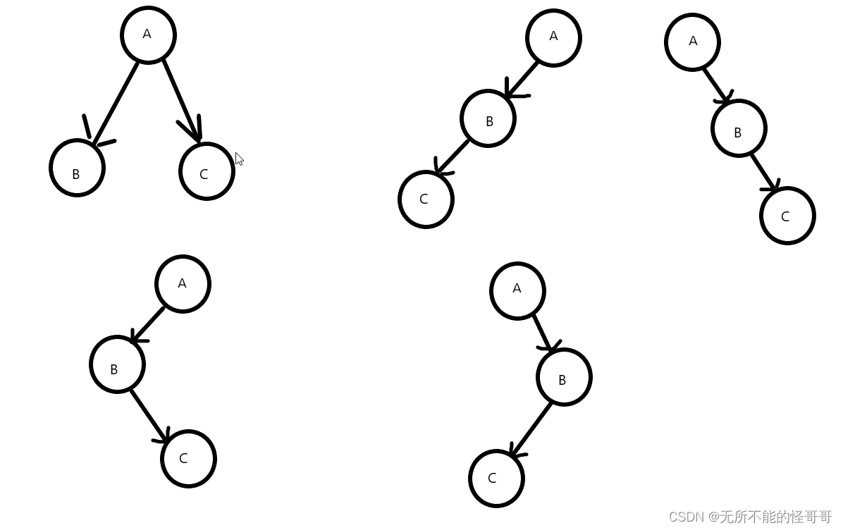 二叉树是一种特殊的树,它的每一个结点最多只有左右两棵子树,那么假设我们给定一个二叉树的结点值的遍历结果,如何恢复出树的结构呢?举个最简单的例子,假设给定一个二叉树的前序遍历结果为ABC,现在要根据遍历结果把二叉树恢复出来,那么能得到唯一一棵二叉树吗?显然是不行的,前序遍历是指先访问根结点,再访问左子树,最后访问右子树,那么以下五种情况都符合前序遍历结果ABC。因此,有必要探讨如何唯一确定一棵二叉树。