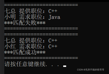 1. class Boos : public Mediator //BOOS直聘平台 2. { 3. private: 4. Role* hr; 5. Role* student; 6. public: 7. virtual void set_hr(Role* hr) 8. { 9. this->hr = hr; 10. } 11. virtual void set_student(Role* student) 12. { 13. this->student = student; 14. } 15. virtual void match() 16. { 17. cout << "=========================" << endl; 18. cout << hr->get_name() << " 提供职位:" << hr->get_office() << endl; 19. cout << student->get_name() << " 需求职位:" << student->get_office() << endl; 20. if (hr->get_office() == student->get_office()) 21. { 22. cout << "***匹配成功***" << endl; 23. } 24. else 25. { 26. cout << "***匹配失败***" << endl; 27. } 28. cout << "=========================" << endl; 29. } 30. };