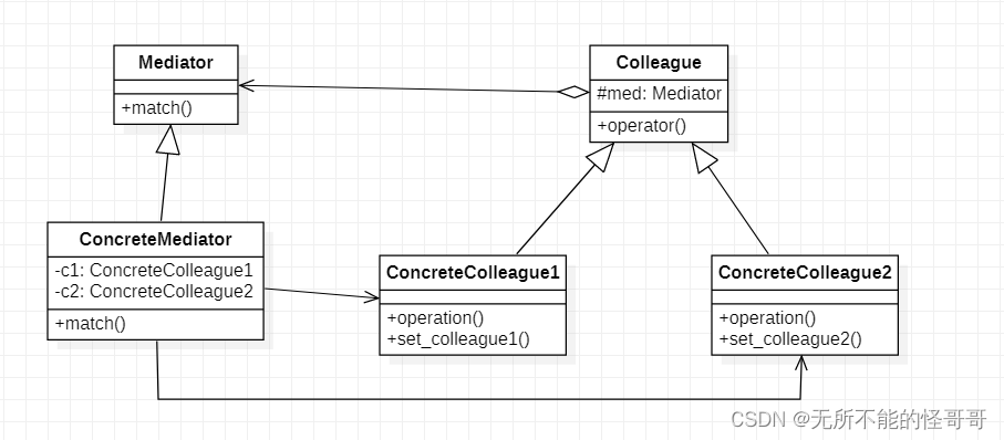 - ConcreteColleague:具体同事类,每个同事类只知道自己的行为,但是他们都包含中介类的引用(都认识中介);