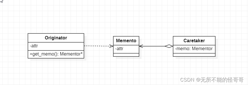 - Originator:原生者角色,需要在备忘录中保存的对象,负责创建一个备忘录,并进行保存和恢复状态的操作;