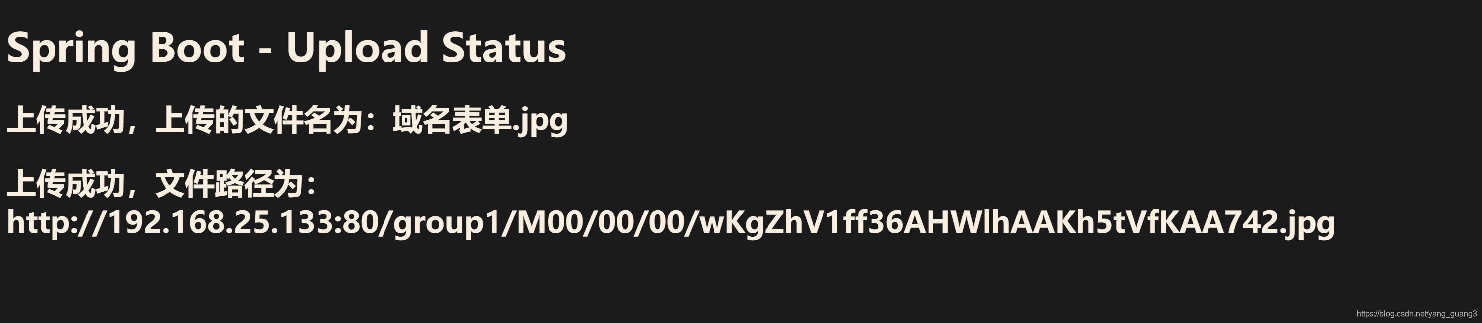 private static Logger logger = LoggerFactory.getLogger(UploadController.class); @RequestMapping("/uploadFile1") public ModelAndView uploadFile1(@RequestParam("file") MultipartFile file, ModelAndView modelAndView) { modelAndView.setViewName("uploadStatus"); if (file.isEmpty()) { modelAndView.addObject("message","上传失败,请选择一个文件上传"); return modelAndView; } try { String path=saveFile(file); modelAndView.addObject("path","上传成功,文件路径为:" + path); modelAndView.addObject("message","上传成功,上传的文件名为:" + file.getOriginalFilename()); } catch (IOException e) { e.printStackTrace(); } return modelAndView; } public String saveFile(MultipartFile multipartFile) throws IOException { String[] fileAbsolutePath={}; String fileName=multipartFile.getOriginalFilename(); String ext = fileName.substring(fileName.lastIndexOf(".") + 1); byte[] file_buff = null; InputStream inputStream=multipartFile.getInputStream(); if(inputStream!=null){ int len1 = inputStream.available(); file_buff = new byte[len1]; inputStream.read(file_buff); } inputStream.close(); FastDFSFile file = new FastDFSFile(fileName, file_buff, ext); try { fileAbsolutePath = FastDFSClient.upload(file); //upload to fastdfs } catch (Exception e) { logger.error("upload file Exception!",e); } if (fileAbsolutePath==null) { logger.error("upload file failed,please upload again!"); } String path=FastDFSClient.getTrackerUrl()+fileAbsolutePath[0]+ "/"+fileAbsolutePath[1]; return path; }
