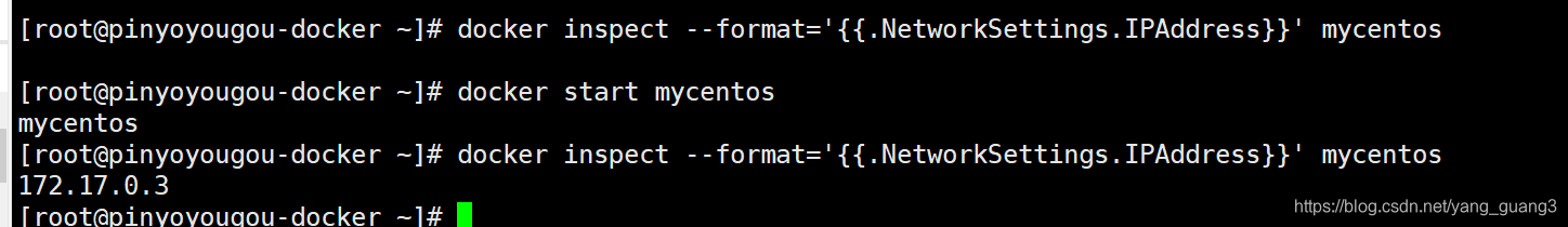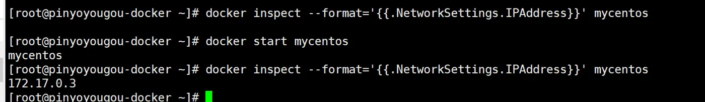 查看容器IP地址:docker inspect --format='{{.NetworkSettings.IPAddress}}' mycentos