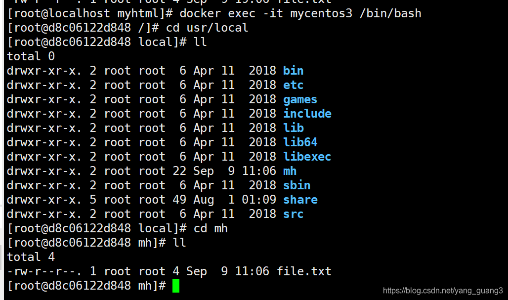 然后创建新的docker容器:docker run -di --name=mycentos3 -v /var/lib/docker/image/myhtml:/usr/local/mh --privileged=true centos:7