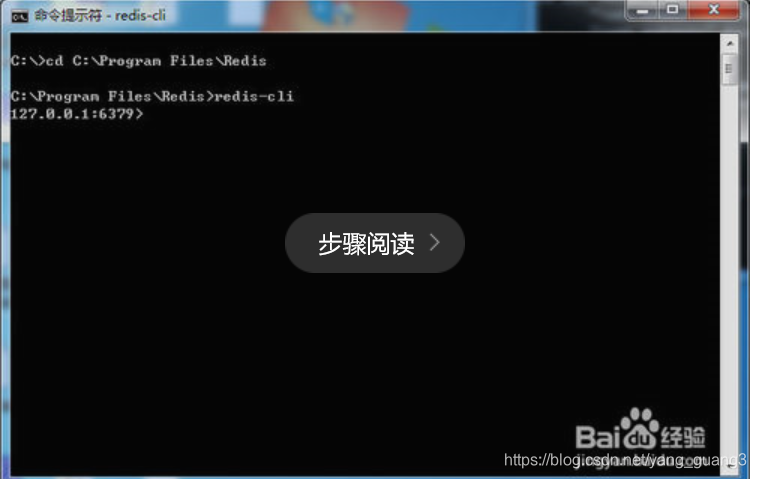 12、最后来测试一下Redis是否正常提供服务。进入Redis的目录,cd C:\Program Files\Redis。输入redis-cli并回车。(redis-cli是客户端程序)如图正常提示进入,并显示正确端口号,则表示服务已经启动。