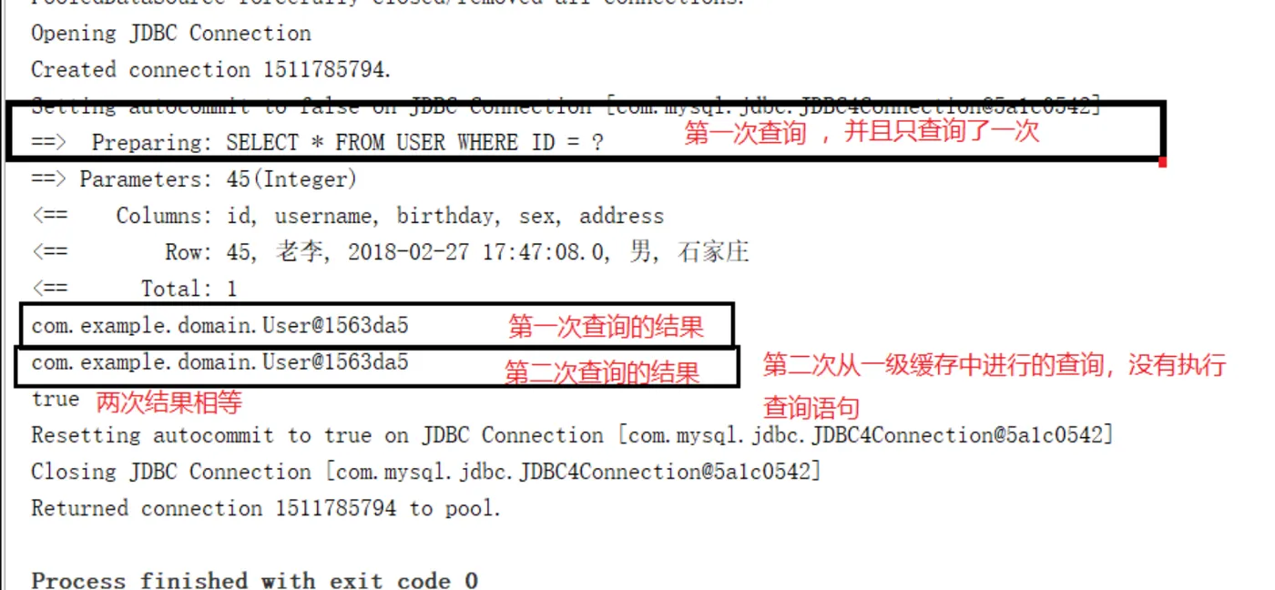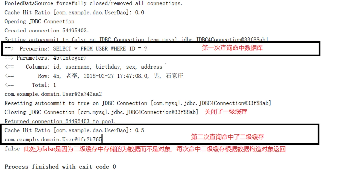 @Test public void findByIdTest(){ session = factory.openSession(); userDao = session.getMapper(UserDao.class); //第一次获取该用户 User user1 = userDao.findById(45); System.out.println(user1); 第二次获取该用户 User user2 = userDao.findById(45); System.out.println(user2); System.out.println(user1 == user2); session.close(); }