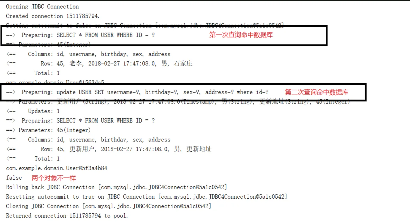 @Test public void findByIdTest(){ session = factory.openSession(); userDao = session.getMapper(UserDao.class); User user1 = userDao.findById(45); System.out.println(user1); //session.commit(); 调用SqlSession的commit方法清空缓存 user1.setUsername("更新用户"); user1.setAddress("更新地址"); userDao.updateUser(user1);//通过更新SqlSession清空缓存 User user2 = userDao.findById(45); System.out.println(user2); System.out.println(user1 == user2); session.close(); }