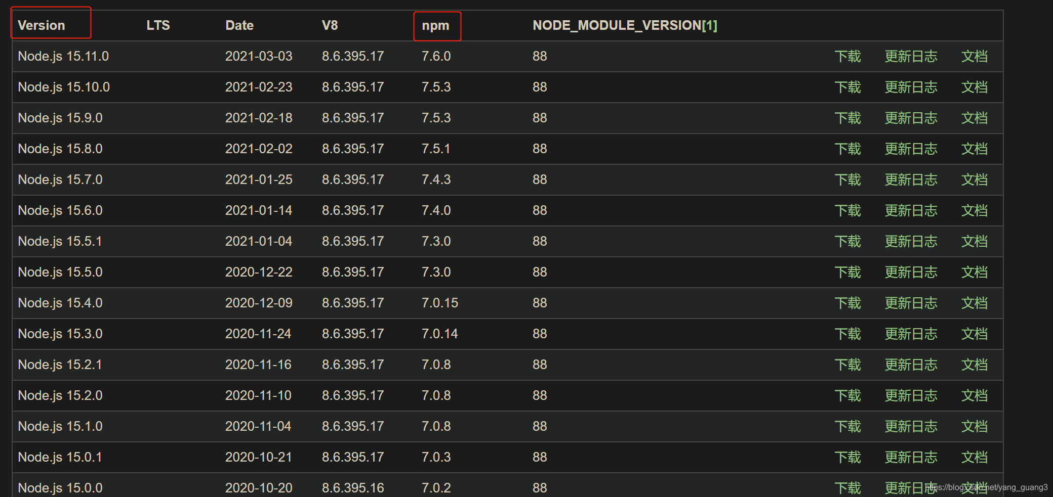 再打开https://nodejs.org/zh-cn/download/releases/ 这个地址查看本地node版本对应哪个npm版本