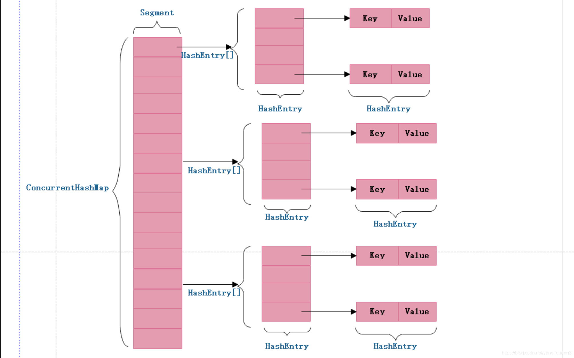 ConcurrentHashMap 为了提高本身的并发能力,在内部采用了一个叫做 Segment 的结构,一个 Segment 其实就是一个类 Hashtable 的结构,Segment 内部维护了一个链表数组,我们用下面这一幅图来看下 ConcurrentHashMap 的内部结构,从下面的结构我们可以了解到,ConcurrentHashMap 定位一个元素的过程需要进行两次Hash操作,第一次 Hash 定位到 Segment,第二次 Hash 定位到元素所在的链表的头部,因此,这一种结构带来的副作用是 Hash 的过程要比普通的 HashMap 要长,但是带来的好处是写操作的时候可以只对元素所在的 Segment 进行操作即可,不会影响到其他的 Segment,这样,在最理想的情况下,ConcurrentHashMap 可以最高同时支持 Segment 数量大小的写操作(刚好这些写操作都非常平均地分布在所有的 Segment上),所以,通过这一种结构,ConcurrentHashMap 的并发能力可以大大的提高。我们用下面这一幅图来看下ConcurrentHashMap的内部结构详情图,如下: