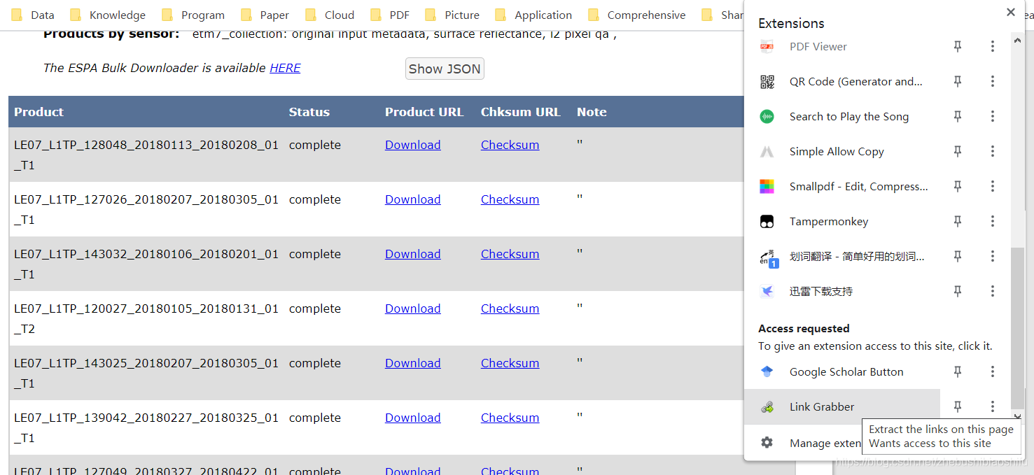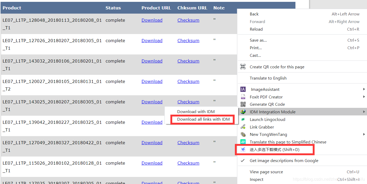 前期的文章Landsat遥感影像数据的批量下载:USGS(https://developer.aliyun.com/article/1159783)中,我们详细介绍了USGS遥感影像批量下载的方法。在利用这一方法生成每一幅影像的下载链接后,我们直接结合可以批量获取网页内下载链接的下载软件进行下载。而在这一过程中发现,在Chrome浏览器中,常用的下载软件只有IDM可以一次性获取全部下载链接(即下图中的Download all links with IDM),迅雷则只能手动多选。