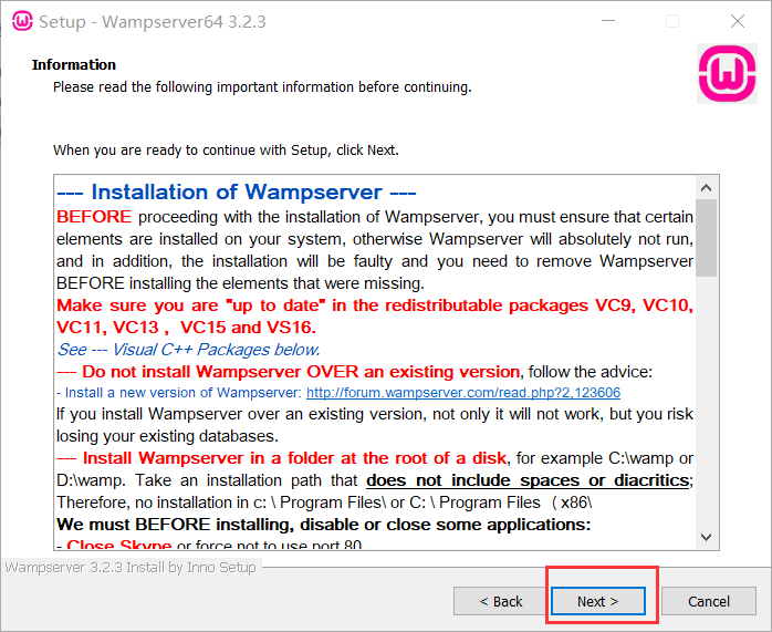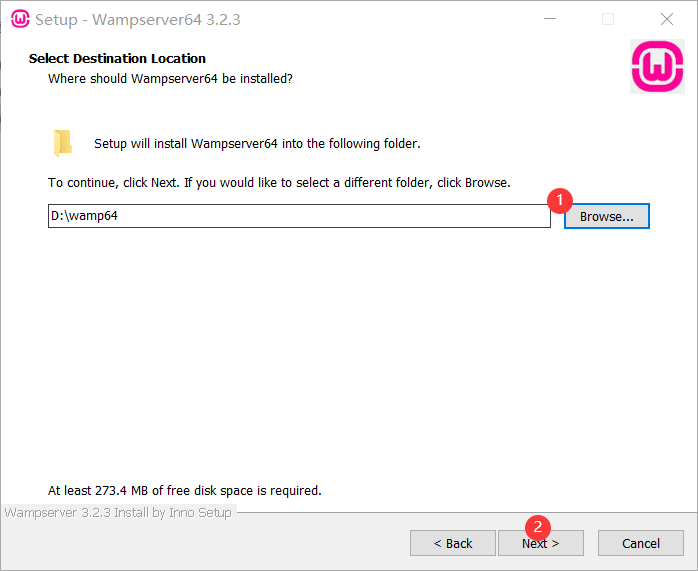 可以直接默认路径也可以点击自定义路径,这里我选择自定义D:\wamp64(安装路径不能有中文、空格或其它特殊符号,否则安装之后会有问题)确认没问题后,点下一步(Next)继续安装然后下一步