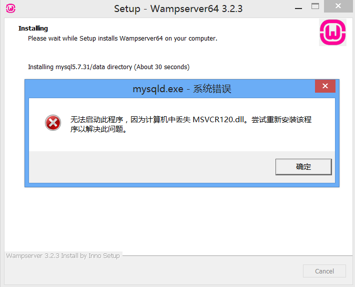在这里win8系统可能会报错,提示找不到msvcr120.dll,不要慌,点击确定结束安装过程,去 http://www.zhaodll.com 查找msvcr120.dll并下载后,将其放在C:\Windows\SysW0W64目录下,然后重新安装一遍即可。
