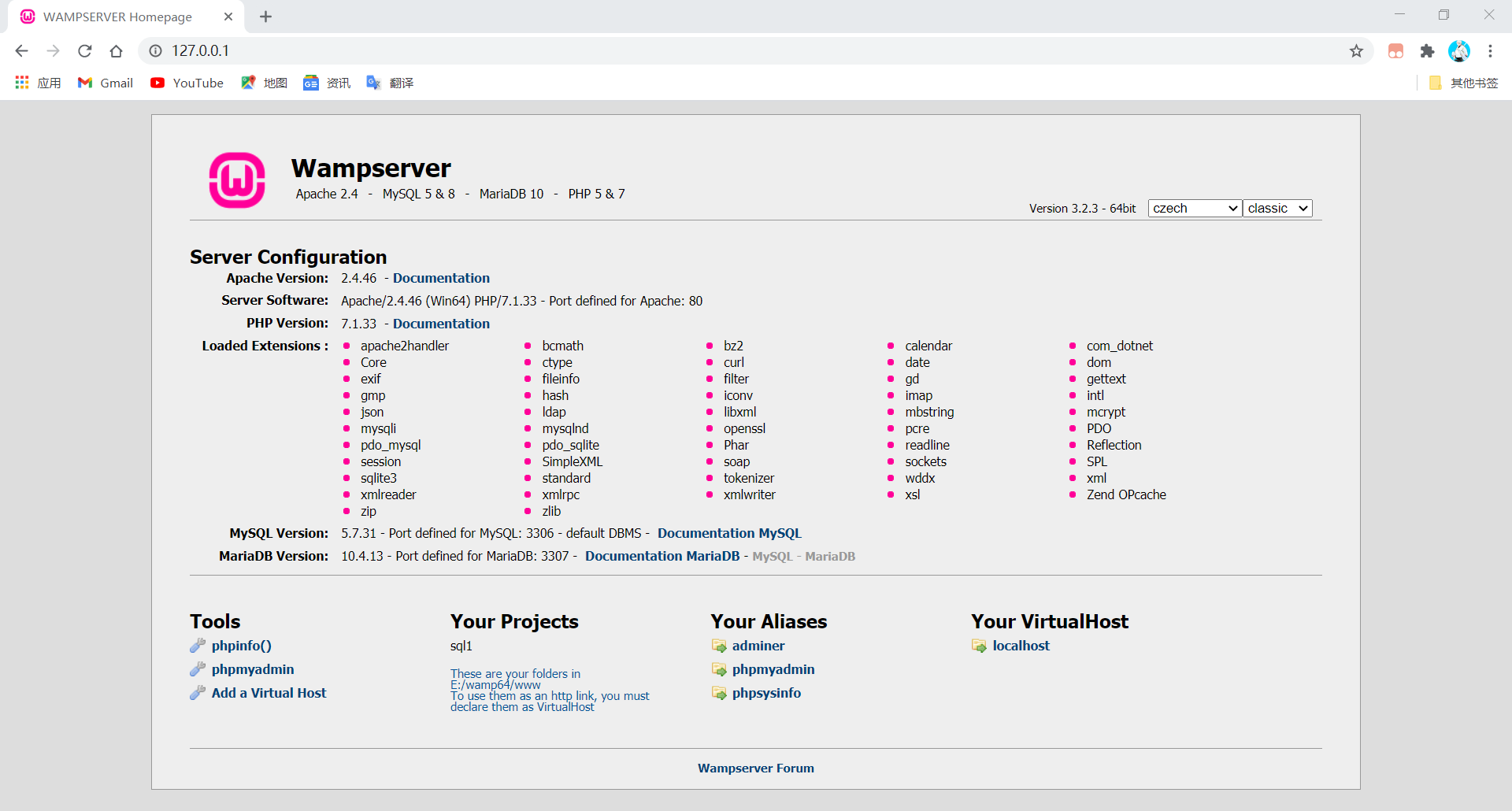 到此,安装就完成了,然后启动Apache服务,启动成功后访问127.0.0.1,表示服务已正常运行,基本环境配置成功