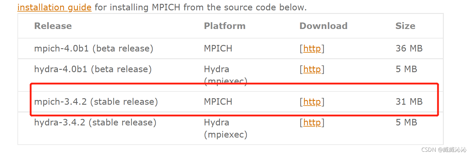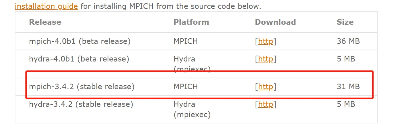 MPICH的最新版本可在此处获取。网站上的所有示例的版本是mpich-3.4.2。下载源代码,解压文件夹,然后切换到MPICH目录