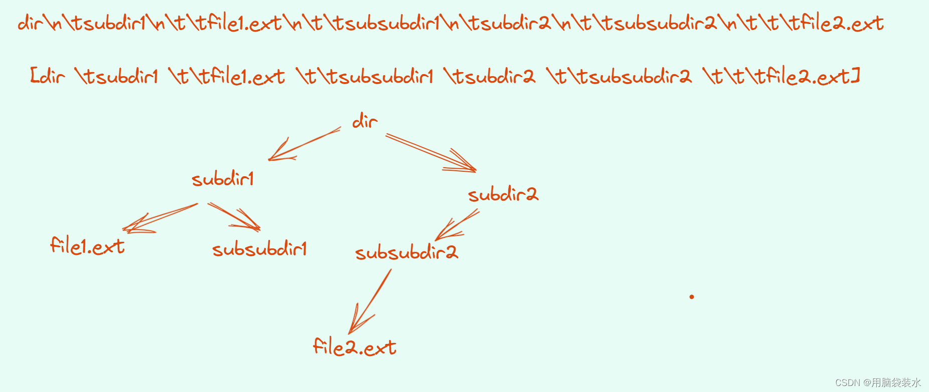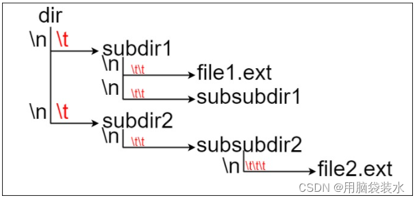 “dir\n\tsubdir1\n\t\tfile1.ext\n\t\tsubsubdir1\n\tsubdir2\n\t\tsubsubdir2\n\t\t\tfile2.ext”