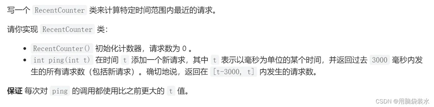 type RecentCounter struct { queue []int } func Constructor() RecentCounter { return RecentCounter{make([]int, 0)} } func (rc *RecentCounter) Ping(t int) int { rc.queue = append(rc.queue, t) // 如果队列中,请求的时间不在[t-3000,t](这个是t是最新一次请求的时间)以内,就给他截掉 for rc.queue[0] < t-3000 { rc.queue = rc.queue[1:] } return len(rc.queue) }