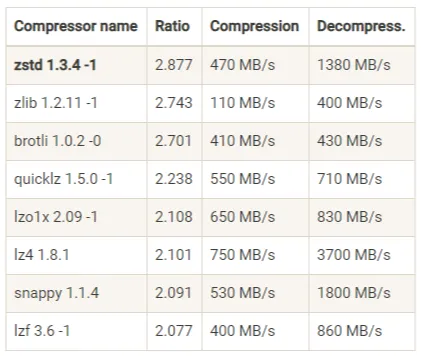 下面这张表是 Facebook Zstandard 官网提供的一份压缩算法 benchmark 比较结果: