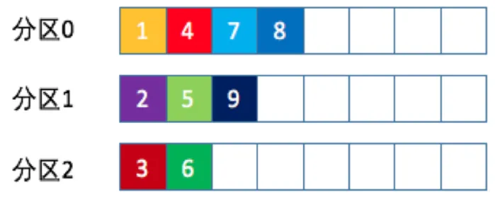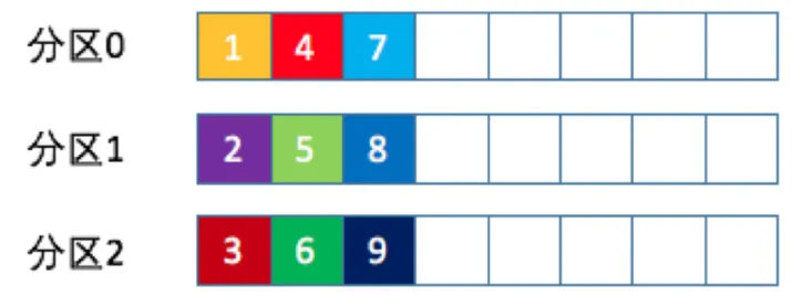 顺序分配。比如一个主题下面有 3 个分区,消息分配的格式如下: