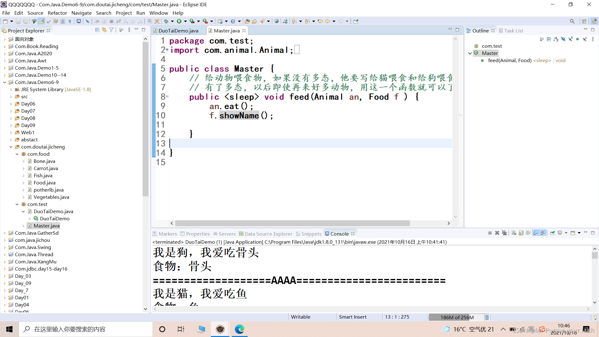 package com.food; public class Bone extends Food{ public void showName() { System.out.println("食物:骨头"); } } package com.food; public class Carrot extends Food{ public void showName() { System.out.println("食物:红萝卜"); } } package com.food; public class Fish extends Food{ public void showName() { System.out.println("食物:鱼"); } } package com.food; public class Food { String name; public Food() { super(); // TODO Auto-generated constructor stub } public Food(String name) { super(); this.name = name; } public String getName() { return name; } public void setName(String name) { this.name = name; } // 食物类里面让它有一个方法 public void showName() { System.out.println("00000000000"); } } package com.food; public class potherlb extends Food{ @Override public void showName() { System.out.println("食物:potherlb"); } } package com.food; public class Vegetables extends Food{ public void showName() { System.out.println("食物:vegetables"); } } package com.test; import com.animal.Animal; import com.animal.Cat; import com.animal.Dog; import com.animal.Duck; import com.animal.Pig; import com.animal.Rabbit; import com.food.Bone; import com.food.Carrot; import com.food.Fish; import com.food.Food; import com.food.Vegetables; import com.food.potherlb; /** * 思路 * 1.首先,创造动物类 * 2 其次,分别创造猫类和狗类(他们继承于动物类) * 3 再者,创建食物类: * 4 再者,猫和狗都有自己不同的爱吃的食物(他们继承于食物类) * 5.主人类(就可以将动物和对应的食物统一起来): * 6 最后,方法的调用(测试) * @author MZFAITHDREAM * */ public class DuoTaiDemo { public static void main(String args[]) { Master master = new Master(); master.feed(new Dog(), new Bone()); System.out.println("===================AAAA========================"); master.feed(new Cat(), new Fish()); System.out.println("======================SSSS====================="); master.feed(new Duck(), new Vegetables()); System.out.println("========================DDDD==================="); master.feed(new Pig(), new potherlb()); System.out.println("=========================FFFF=================="); master.feed(new Rabbit(), new Carrot()); System.out.println("++++++++++++++++++++++++++++++++++++++++"); //父类向子类 Animal a =new Cat(); a.name="hihi"; a.age="2"; System.out.println(a.name); System.out.println(a.age); a.cry(); a.eat(); a.sleep(); System.out.println("==========================================="); Animal b =new Dog(); b.cry(); b.eat(); b.sleep(); Animal c =new Duck(); c.eat(); c.cry(); c.sleep(); System.out.println("==========================================="); Animal e=new Pig(); e.eat(); e.cry(); e.sleep(); System.out.println("==========================================="); Animal f =new Rabbit(); f.cry(); f.eat(); f.sleep(); System.out.println("==========================================="); Food ab=new Bone(); ab.showName(); Food bc=new Carrot(); bc.showName(); Food cd=new Fish(); cd.showName(); Food de=new potherlb(); de.showName(); Food ef=new Vegetables(); ef.showName(); // hin方便,可以再试试 } } package com.test; import com.animal.Animal; import com.food.Food; public class Master { // 给动物喂食物,如果没有多态,他要写给猫喂食和给狗喂食两个方法 // 有了多态,以后即使再来好多动物,用这一个函数就可以了 public <sleep> void feed(Animal an, Food f ) { an.eat(); f.showName(); } }