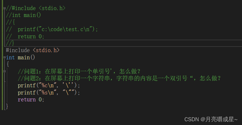 1. #include <stdio.h> 2. int main() 3. { 4. //问题1:在屏幕上打印一个单引号',怎么做? 5. //问题2:在屏幕上打印一个字符串,字符串的内容是一个双引号“,怎么做? 6. printf("%c\n", '\''); 7. printf("%s\n", "\""); 8. return 0; 9. }