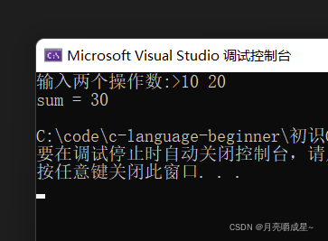 1. #include <stdio.h> 2. int main() 3. { 4. int num1 = 0; 5. int num2 = 0; 6. int sum = 0; 7. printf("输入两个操作数:>"); 8. scanf("%d %d", &num1, &num2); 9. sum = num1 + num2; 10. printf("sum = %d\n", sum); 11. return 0; 12. }