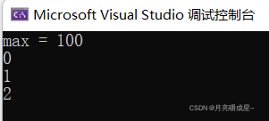 1. #include <stdio.h> 2. //举例 3. enum Sex 4. { 5. MALE, 6. FEMALE, 7. SECRET 8. }; 9. //括号中的MALE,FEMALE,SECRET是枚举常量 10. int main() 11. { 12. //字面常量演示 13. 3.14;//字面常量 14. 1000;//字面常量 15. //const 修饰的常变量 16. const float pai = 3.14f; //这里的pai是const修饰的常变量 17. //pai = 5.14;//是不能直接修改的!(所以这句会报错)我们把它先注销掉 18. //#define的标识符常量 演示 19. #define MAX 100 20. printf("max = %d\n", MAX); 21. //枚举常量演示 22. printf("%d\n", MALE); 23. printf("%d\n", FEMALE); 24. printf("%d\n", SECRET); 25. //注:枚举常量的默认是从0开始,依次向下递增1的 26. 27. return 0; 28. }