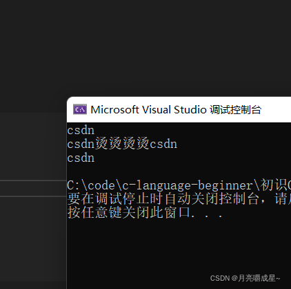 1. #include <stdio.h> 2. //下面代码,打印结果是什么?为什么?(突出'\0'的重要性) 3. int main() 4. { 5. char arr1[] = "csdn"; 6. char arr2[] = { 'c', 's', 'd' ,'n'}; 7. char arr3[] = { 'c', 's', 'd','n ','\0' }; 8. printf("%s\n", arr1); 9. printf("%s\n", arr2); 10. printf("%s\n", arr3); 11. return 0; 12. }