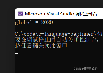 1. #include <stdio.h> 2. int global = 2019;//全局变量 3. int main() 4. { 5. int local = 2018;//局部变量 6. //下面定义的global会不会有问题? 7. int global = 2020;//局部变量 8. printf("global = %d\n", global); 9. return 0; 10. }