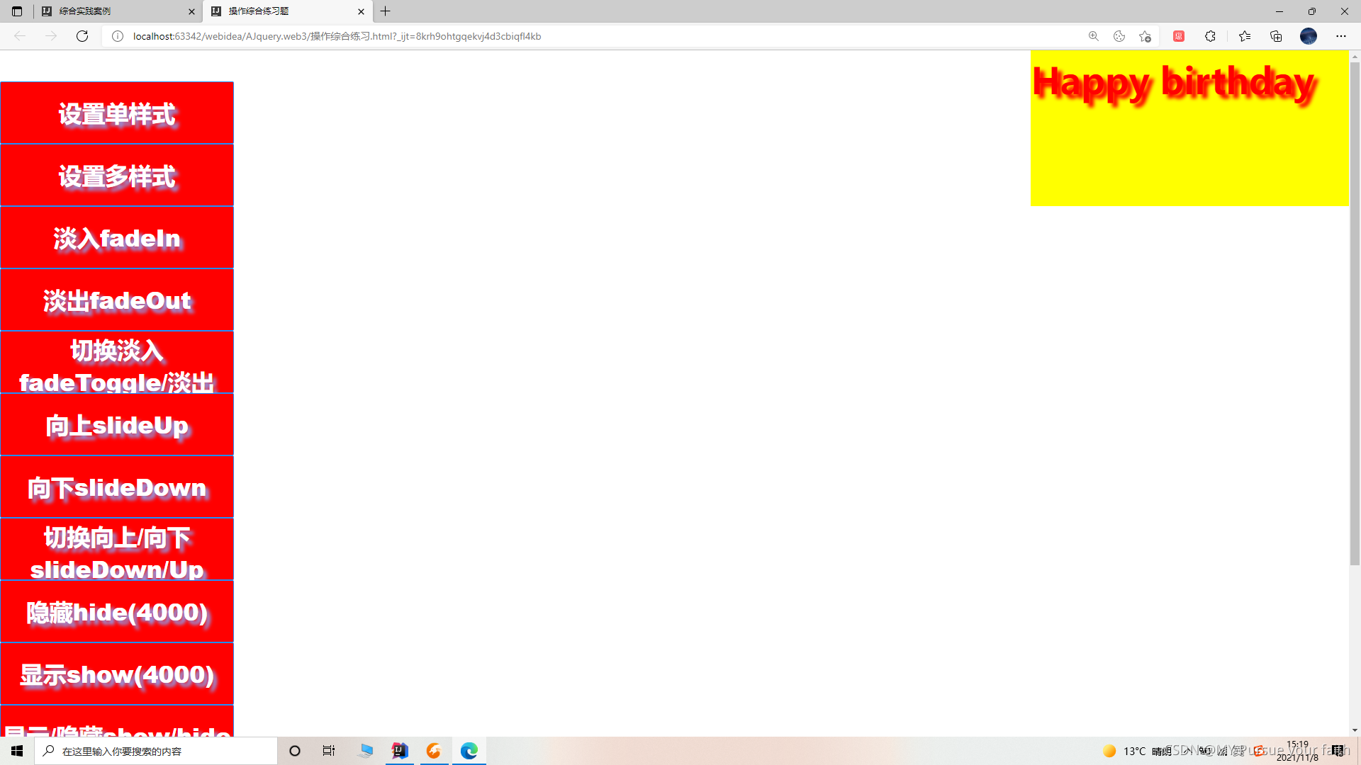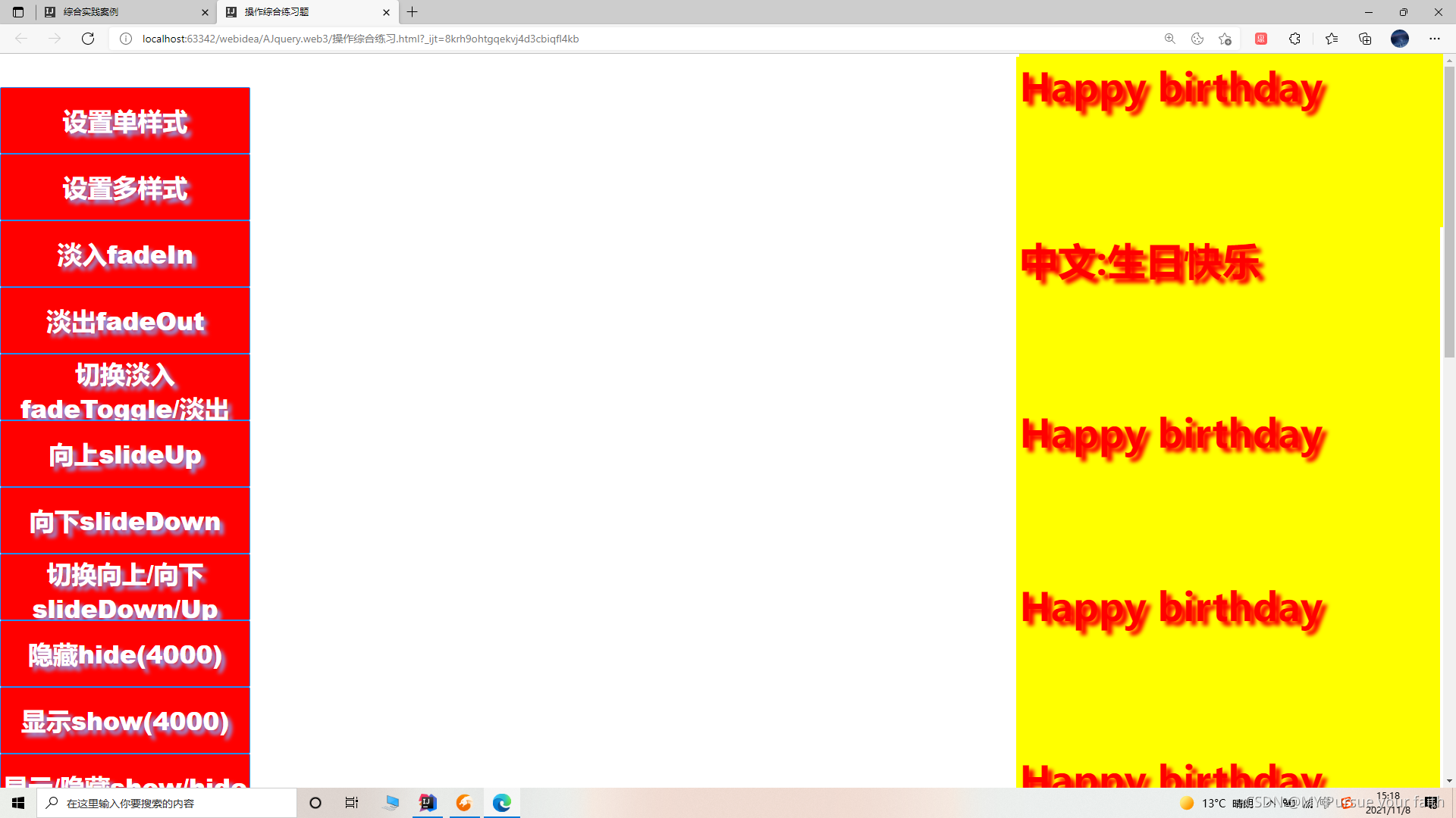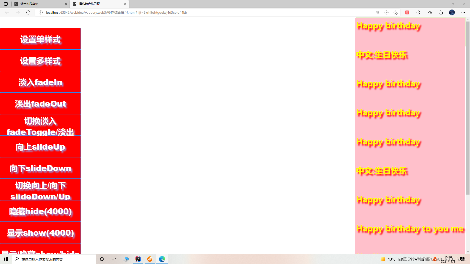 <!DOCTYPE html> <html lang="en"> <head> <meta charset="UTF-8"> <!--导入jquery文件--> <script src="jquery-3.6.js"></script> <title>操作综合练习题</title> <style> *{ margin: 0px; padding: 0px; background: white; font-size: 30px; font-weight: bold; text-shadow: 5px 5px 5px #9198e5; } button{ background: #FF0000; color: white; font-weight: bolder; margin: auto; padding: 2px; border: solid 1px dodgerblue; height: 80px; width: 300px; } div{ height: 100px; width: 400px; background: pink; color:yellow ; text-shadow: 6px 5px 5px red; float: right; padding: 4px; } article{ padding: 3px; } div1{ height: 200px; width: 200px; background-color: lightblue; } div2{ margin: auto; float: left; } /*样式内容*/ </style> </head> <body> <div style="background-color: #e5eecc;margin: auto"> <div>Happy birthday</div> <div>中文:生日快乐</div> <div>Happy birthday</div> <div>Happy birthday</div> <div>Happy birthday</div> <div>中文:生日快乐</div> <div>Happy birthday</div> <div>Happy birthday to you me </div> <div>笑一笑是年少</div> <div>想一想今天是多少号</div> <div1>Hello Wworld</div1> <div1>想一想今天是多少号</div1> </div> <br> <div2 style="margin: auto ; height: 200px;width: 230px" > <button>设置单样式</button> <button>设置多样式</button> <button>淡入fadeIn</button> <button>淡出fadeOut</button> <button>切换淡入fadeToggle/淡出</button> <button>向上slideUp</button> <button>向下slideDown</button> <button>切换向上/向下slideDown/Up</button> <button>隐藏hide(4000)</button> <button>显示show(4000)</button> <button>显示/隐藏show/hide</button> <button>增加类</button> <button>删除类</button> <button>切换类</button> </div2> <!--样式操作题--> <script> $(function () { $('button').eq(0).click(function () { $('div').css('width',400); }); $('button').eq(1).click(function () { $('div').css({ width: 500, color: 'red', height: 200, backgroundColor: 'yellow', fontSize: 46, }); $('button').eq(2).click(function () { $('div').fadeIn(2000) }); $('button').eq(3).click(function () { $('div').fadeOut(3000) }); $('button').eq(4).click(function () { $('div').fadeToggle(3000) }); $('button').eq(5).click(function () { $('div').slideUp(3000); }); $('button').eq(6).click(function () { $('div').slideDown(3000); }); $('button').eq(7).click(function () { $('div').slideToggle(4000); }); $('button').eq(8).click(function () { $('div').hide(4000); }); $('button').eq(9).click(function () { $('div').show() }); $('button').eq(10).click(function () { $('div').toggle(3000); }); }) }) </script> </body> </html>