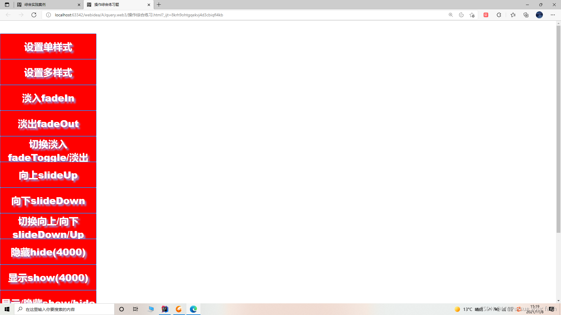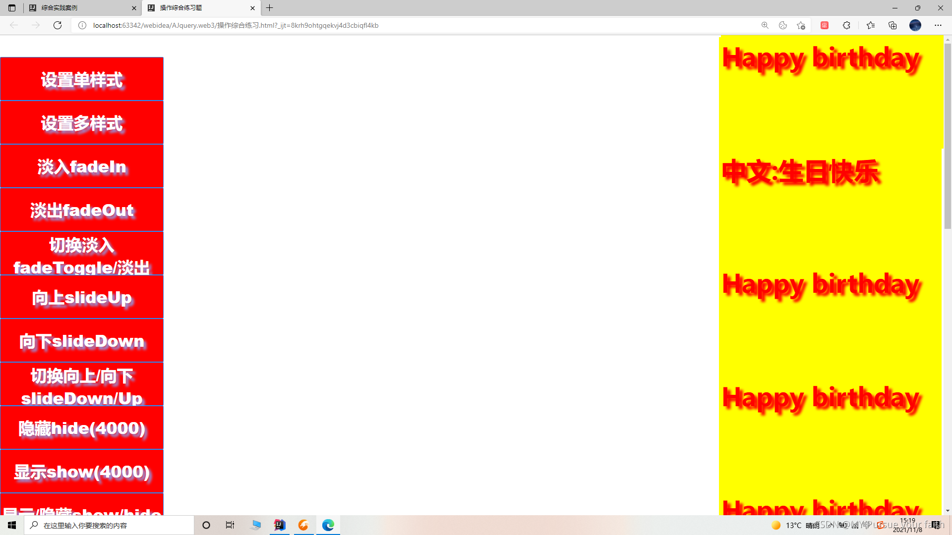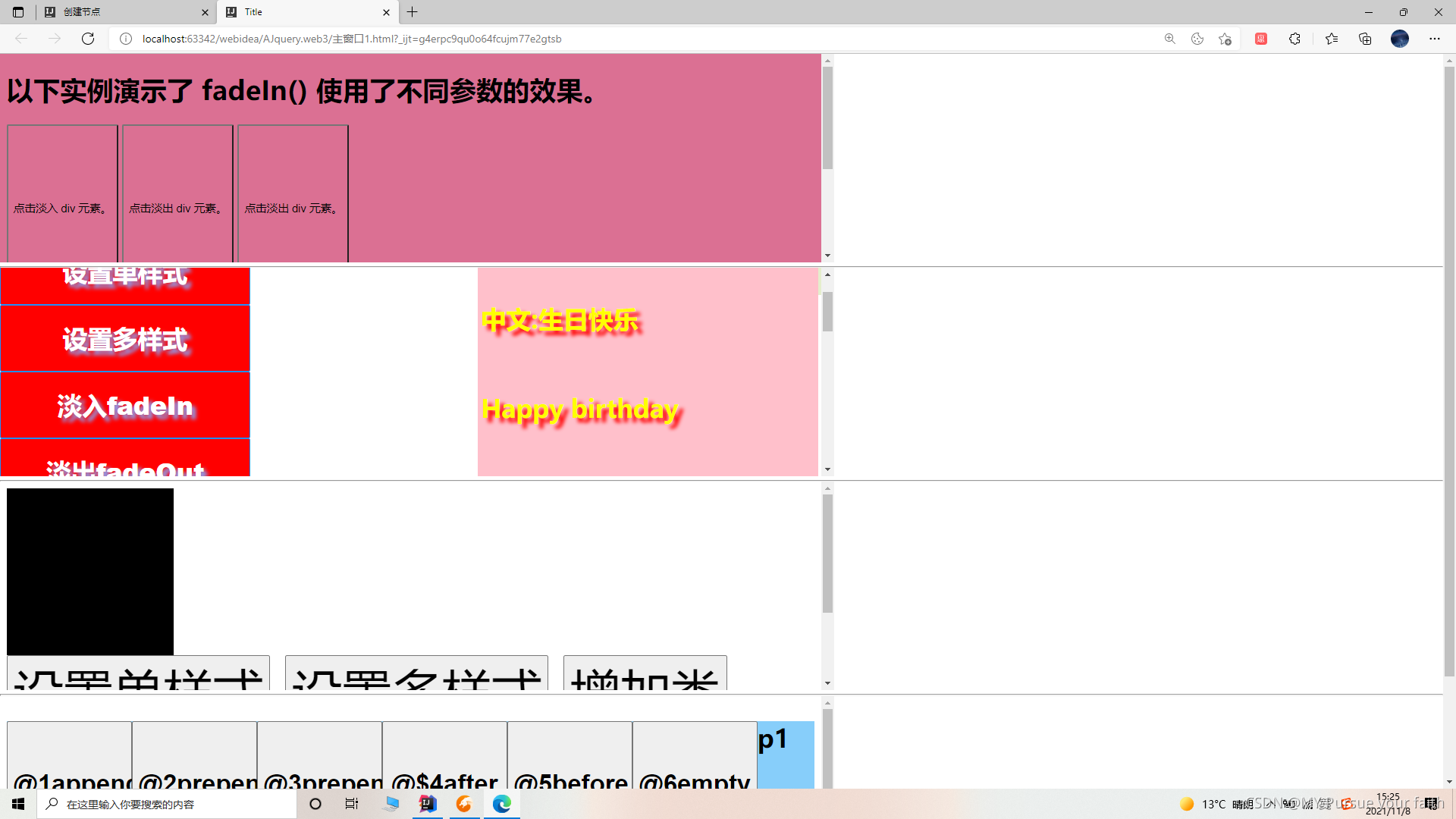 <!DOCTYPE html> <html lang="en"> <head> <meta charset="UTF-8"> <!--导入jquery文件--> <script src="jquery-3.6.js"></script> <title>操作综合练习题</title> <style> *{ margin: 0px; padding: 0px; background: white; font-size: 30px; font-weight: bold; text-shadow: 5px 5px 5px #9198e5; } button{ background: #FF0000; color: white; font-weight: bolder; margin: auto; padding: 2px; border: solid 1px dodgerblue; height: 80px; width: 300px; } div{ height: 100px; width: 400px; background: pink; color:yellow ; text-shadow: 6px 5px 5px red; float: right; padding: 4px; } article{ padding: 3px; } div1{ height: 200px; width: 200px; background-color: lightblue; } div2{ margin: auto; float: left; } /*样式内容*/ </style> </head> <body> <div style="background-color: #e5eecc;margin: auto"> <div>Happy birthday</div> <div>中文:生日快乐</div> <div>Happy birthday</div> <div>Happy birthday</div> <div>Happy birthday</div> <div>中文:生日快乐</div> <div>Happy birthday</div> <div>Happy birthday to you me </div> <div>笑一笑是年少</div> <div>想一想今天是多少号</div> <div1>Hello Wworld</div1> <div1>想一想今天是多少号</div1> </div> <br> <div2 style="margin: auto ; height: 200px;width: 230px" > <button>设置单样式</button> <button>设置多样式</button> <button>淡入fadeIn</button> <button>淡出fadeOut</button> <button>切换淡入fadeToggle/淡出</button> <button>向上slideUp</button> <button>向下slideDown</button> <button>切换向上/向下slideDown/Up</button> <button>隐藏hide(4000)</button> <button>显示show(4000)</button> <button>显示/隐藏show/hide</button> <button>增加类</button> <button>删除类</button> <button>切换类</button> </div2> <!--样式操作题--> <script> $(function () { $('button').eq(0).click(function () { $('div').css('width',400); }); $('button').eq(1).click(function () { $('div').css({ width: 500, color: 'red', height: 200, backgroundColor: 'yellow', fontSize: 46, }); $('button').eq(2).click(function () { $('div').fadeIn(2000) }); $('button').eq(3).click(function () { $('div').fadeOut(3000) }); $('button').eq(4).click(function () { $('div').fadeToggle(3000) }); $('button').eq(5).click(function () { $('div').slideUp(3000); }); $('button').eq(6).click(function () { $('div').slideDown(3000); }); $('button').eq(7).click(function () { $('div').slideToggle(4000); }); $('button').eq(8).click(function () { $('div').hide(4000); }); $('button').eq(9).click(function () { $('div').show() }); $('button').eq(10).click(function () { $('div').toggle(3000); }); }) }) </script> </body> </html>