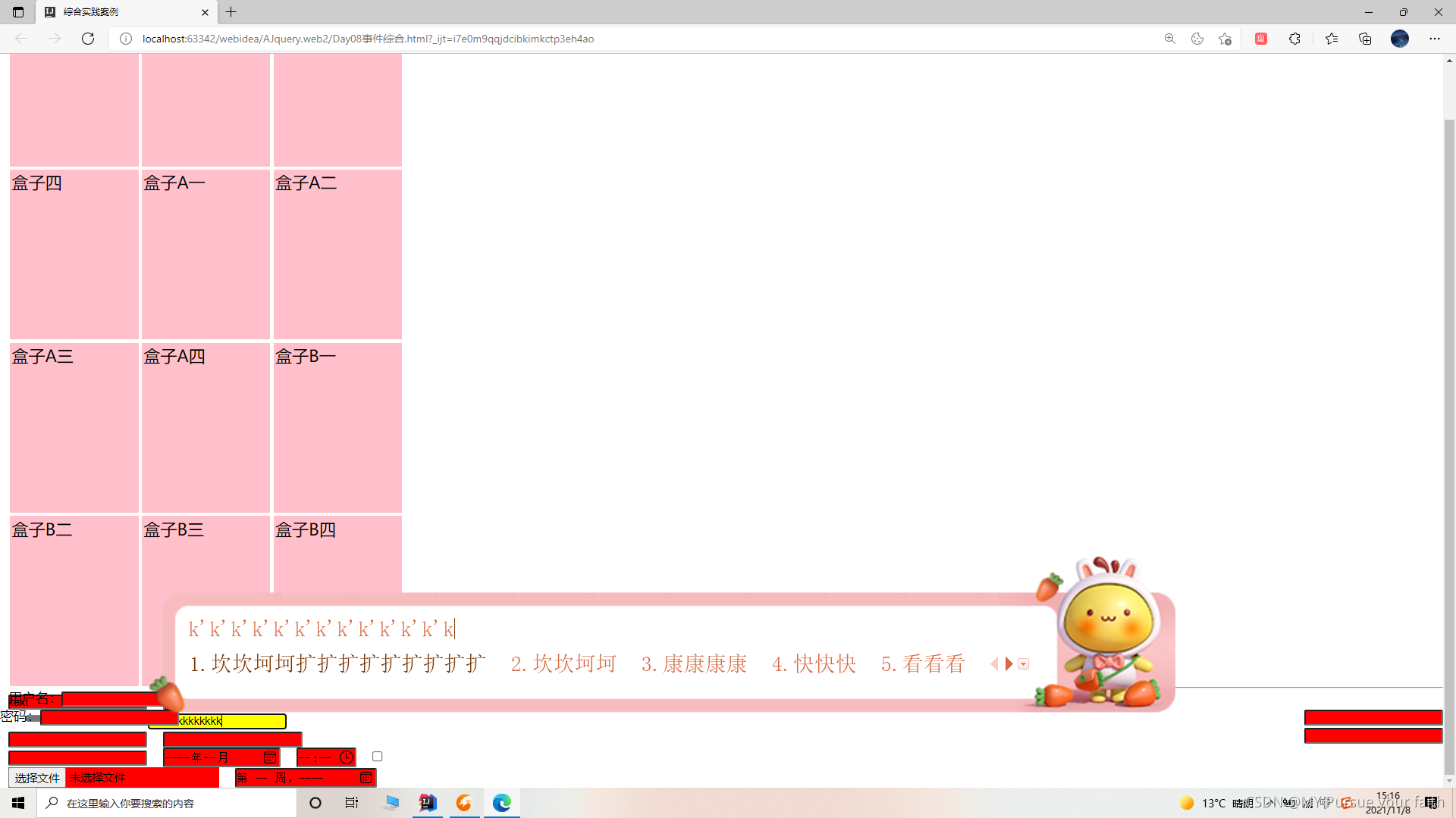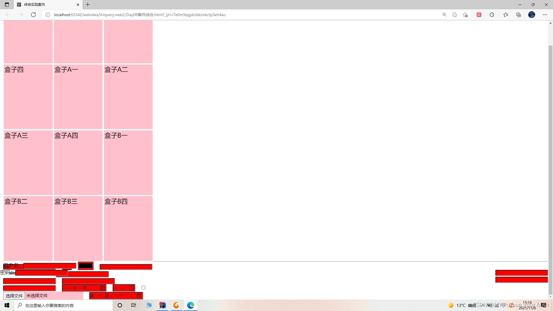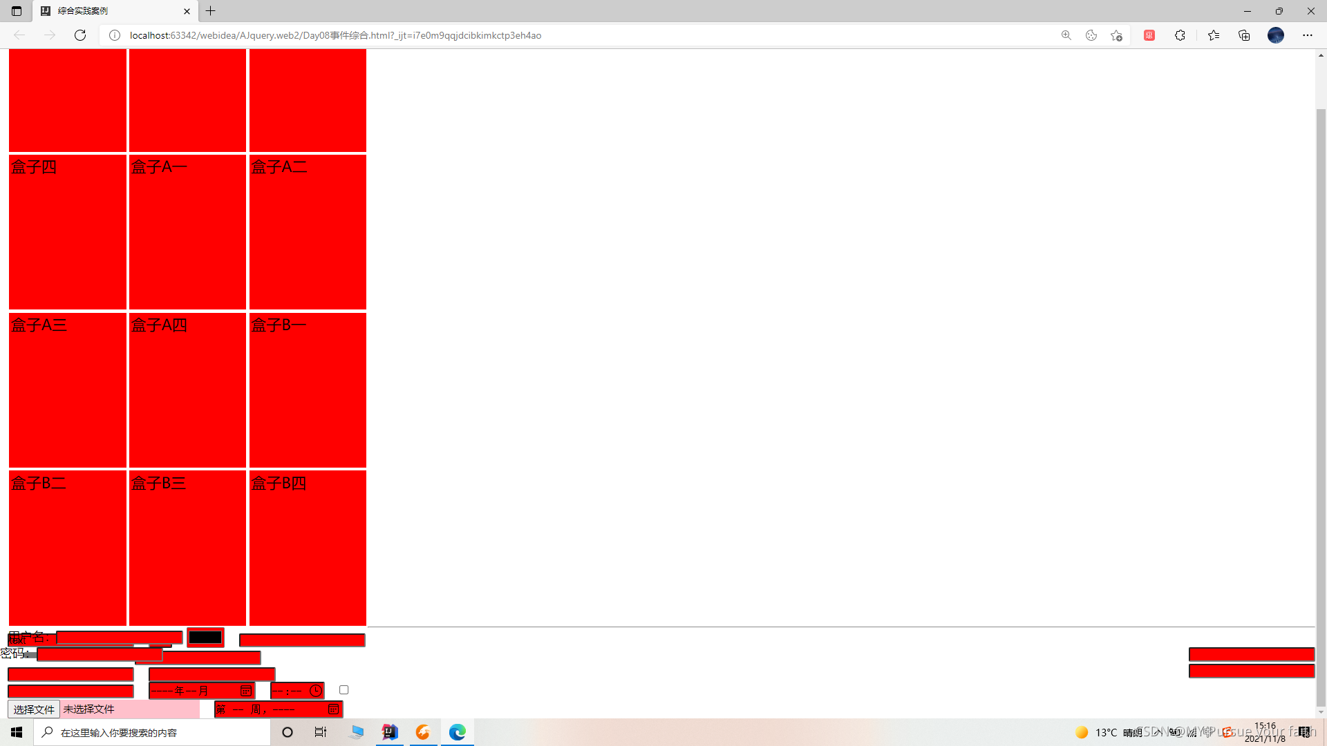 <!DOCTYPE html> <html lang="en"> <head> <meta charset="UTF-8"> <!--导入jquery文件--> <style> *{ padding: 0px; margin: 0px; } div{ font-size: 20px; height: 200px; width: 150px; background: gold; float: left; padding: 2px; margin: 2px; border-right: #0099FF; display: block; } article{ height:831px; width: 475px; margin: auto 10px; border: 100px; border-right: red 5px; border-left: #ffb3c4; border-top: #00FF99; border-bottom: #0099FF; } article1{ margin: auto 10px; border: 100px; border-right: red 5px; border-left: #ffb3c4; border-top: #00FF99; border-bottom: #0099FF; float: contour; } #wer{ height: 200px; width: 200px; } </style> <script src="jquery-3.6.js"></script> <title>综合实践案例</title> </head> <body> <article> <div>盒子一</div> <div>盒子二</div> <div>盒子三</div> <div>盒子四</div> <div>盒子A一</div> <div>盒子A二</div> <div>盒子A三</div> <div>盒子A四</div> <div>盒子B一</div> <div>盒子B二</div> <div>盒子B三</div> <div>盒子B四</div> <input type=" " value="text"> <input type="button" value="提交"> <input type="color" value="red"> <input type="password"> <input type="range"> <input type="url"> <input type="tel"> <input type="search"> <input type="email"> <input type="month"> <input type="time"> <input type="checkbox"> <input type="file"> <input type="week"> <script> /* /!*鼠标移入变yellow*!/ $(function () { $('div').mouseenter(function () { $('div').css('background', "yellow"); }); /*鼠标移入变red*/ $(function () { $('div').mouseover(function () { $('div').css('background', "red"); }); /*移出变pink*/ $(function () { $('div').mouseleave(function () { $('div').css('background', "pink"); }); $('div').click(function () { $('div').css('background', "green"); }) /* /!*鼠标移出变绿*!/ $(function () { $('div').mouseout(function () { $('div').css('background', "#00A40C"); });*/ /*点击变yellow*/ /* $(function () { $('div').mouseup(function () { $('div').css('background', "red"); }); })*/ /* })*/ /* })*/ }) }); </script> </article> <hr> <article1> 用户名:<input type="text" value=""><br> 密码:<input type="password" value=""> <script src="../cctv/jquery-3.6.js"></script> <script> $(function () { $(document).click(function () { $('input').css('background-color','red'); $('input').keydown(function () { $(this).css('background-color','pink'); }); $('input').keyup(function () { $(this).css('background-color','yellow'); }); $(document).keydown(function () { $(this).css('background-color','yellow'); if (e.keyCode=='13') { alert("提交吗") } }); }) }) </script> </article1> <article2 style="float:right;"> <p><input type="text"></p> <p><input type="password"></p> <script> /*获取焦点*/ $('input').focus(function () { $(this).css('background-color', 'pink'); /*失去焦点*/ $('input').blur(function () { $(this).css('background-color', 'red'); }) }); </script> </article2> </body> </html>