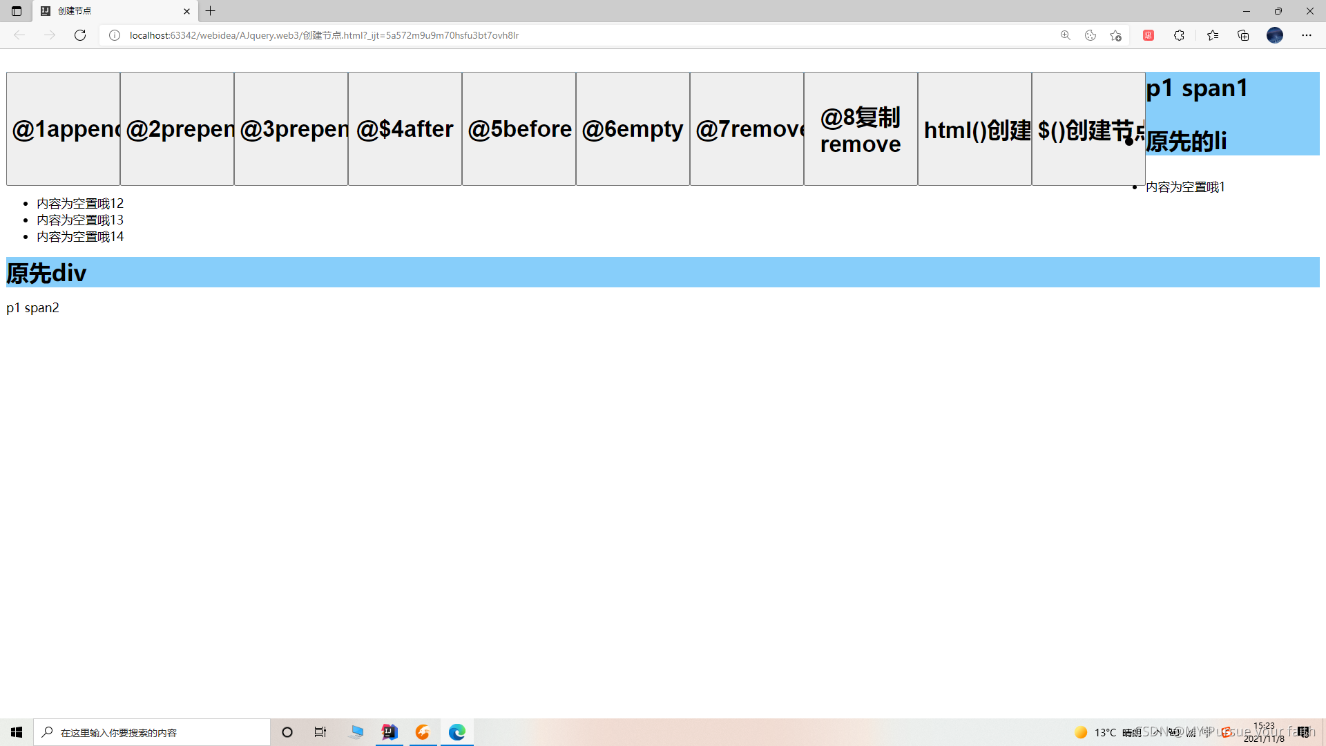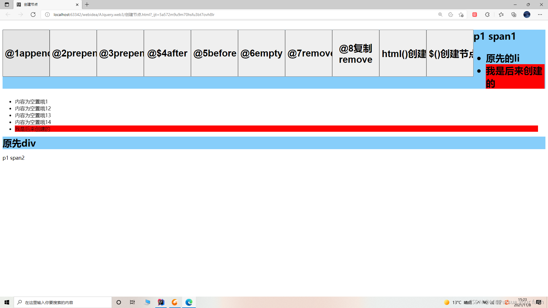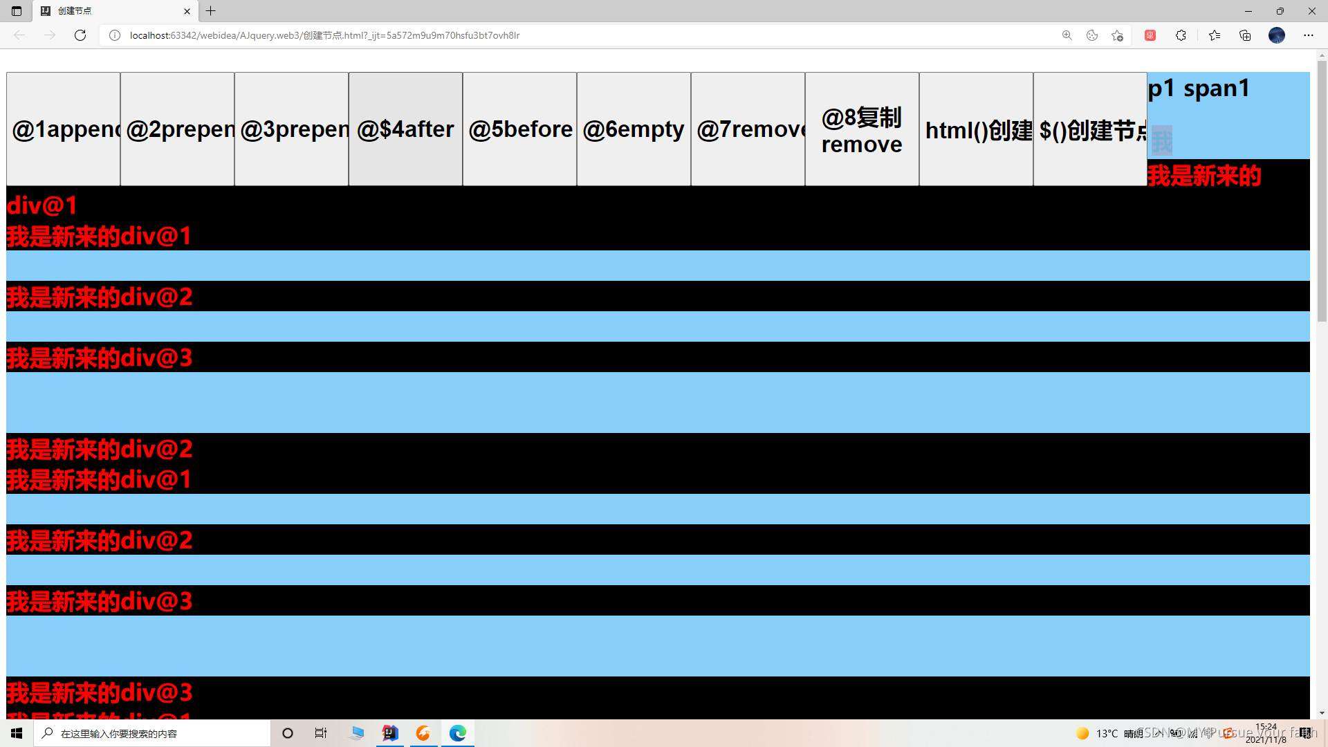 <!DOCTYPE html> <html lang="en"> <head> <meta charset="UTF-8"> <title>创建节点</title> <style> div{ font-size: 30px; font-weight: bolder; background-color:lightskyblue; } button{ height: 150px; width: 150px; font-size: 30px; font-weight: bolder; float: left; } input{ float: left; height: 150px; width: 150px; font-size: 30px; font-weight: bolder; } #div1{ width: 100px; height: 200px; background: yellow; } #div2{ width: 100px; height: 200px; background: cornflowerblue; } </style> <script src="jquery-3.6.js"></script> </head> <body> <button>@1append</button> <button>@2prepend</button> <button>@3prependTo</button> <button>@$4after</button> <button>@5before</button> <button>@6empty</button> <button>@7remove</button> <button>@8复制remove</button> <input type="button" value="html()创建节点" id="btn1"> <input type="button" value="$()创建节点" id="btn2"> <div> <p> p1 <span>span1</span> </p> <ul> <li>原先的li</li> </ul> </div> <ul> <li>内容为空置哦1</li> <li class="li3"> 内容为空置哦12</li> <li>内容为空置哦13</li> <li>内容为空置哦14</li> </ul> <div>原先div</div> <div1 id="div1"> <p>p1 <div2>span2</div2> </p> </div1> <script> /*创建节点*/ $(function () { $('#btn1').click(function () { $('div').html('<h2>我是新的内容</h2><a href="Jouery效果@1.html" style="font-size: 34px">效果1</a>'); $('div').html('<h1 style="background-color: #00BFFF">我是新的内容2</h1><a href="Jouery效果@1.html">效果1</a>') }) $('#btn2').click(function () { var $divNew=$('<div>我是div创建的行内容</div>'); $('div').append($divNew); console.log($('<div>我是div创建的行内容</div>')) ; }) /*增加节点*/ $(function () { /*创建节点*/ var $li =$('<li style="background-color: #FF0000">我是后来创建的</li>'); var $div=$('<div style="background-color: black; font-weight: bold; color: #FF0000" >我是新来的div@1</div><br>' + '<div style="background-color: black; font-weight: bold; color: #FF0000" >我是新来的div@2</div><br>' + '<div style="background-color: black; font-weight: bold; color: #FF0000" >我是新来的div@3</div><br>'); $('button').eq(0).click(function () { $('ul').append($li); $('ul').hide(4000); }); $('button').eq(1).click(function () { $('ul').prepend($li); }); $('button').eq(2).click(function () { $('ul').prepend($li); $li.prependTo('ul'); $('ul').hide(4000); }); $('button').eq(3).click(function () { $('ul').after($div); //在选择器$('div')的后面增加新内容 $div.insertAfter('div');//把div的新内容增加到div的后面 }); $('button').eq(4).click(function () { $('ul').before($div); //在选择器$('div')的后面增加新内容 $div.before('div');//把div的新内容增加到div的后面 $('ul').hide(4000); }); /*删除节点*/ $('button').eq(5).click(function () { /* $('ul').html();*/ $('ul').empty(); }); $('button').eq(6).click(function () { /* $('ul').html();*/ $('.li3').remove(); $('li').parent().remove(); }); $('button').eq(7).click(function () { var $div2 =('#div1').clone(); $('body').append($div2); $div2.attr('id','div2'); $('#div1').click(function () { alert('123456789'); }) }); }) }) </script> </body> </html>