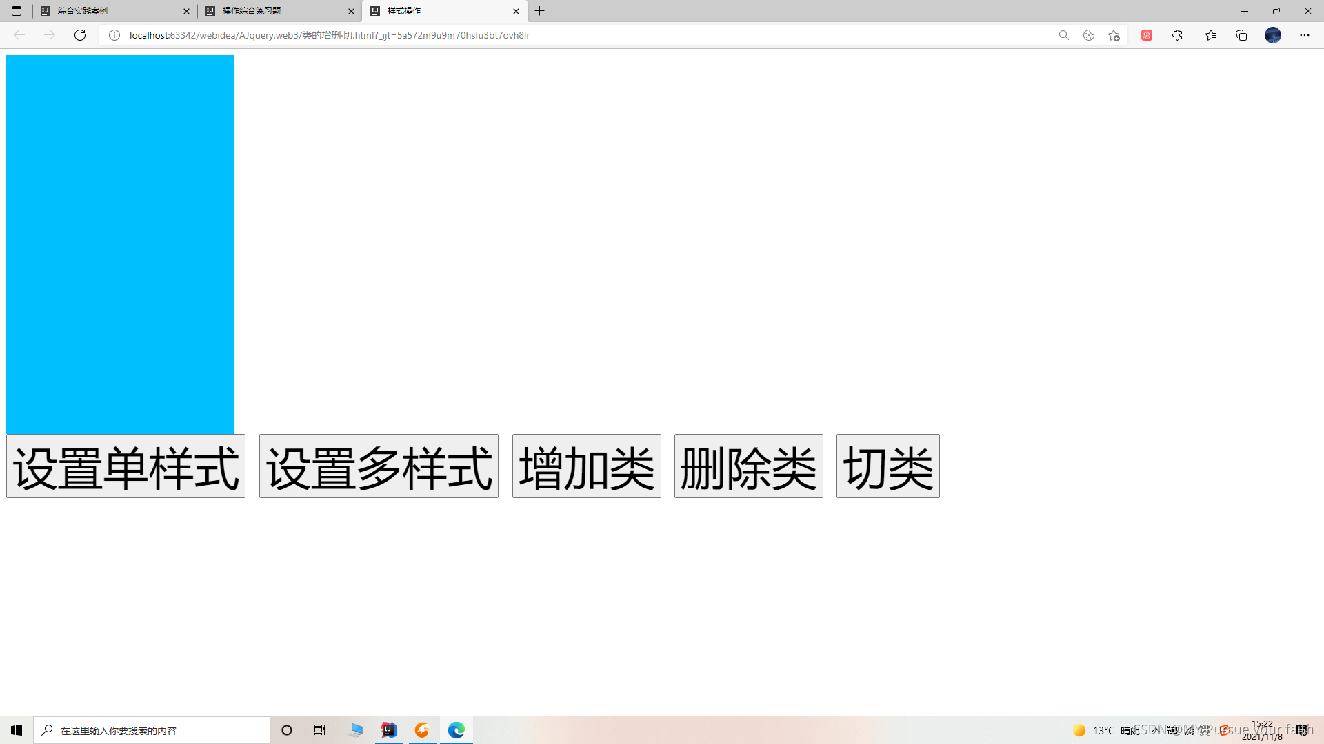 <!DOCTYPE html> <html lang="en"> <head> <meta charset="UTF-8"> <style> *{ font-size: 60px; } div{ height: 200px; width: 200px; background: black; } .e{ height: 500px; background: deeppink; width: 400px; } .we{ background-color: #00BFFF; } </style> <title>样式操作</title> </head> <script src="jquery-3.6.js"></script> <body> <div></div> <button>设置单样式</button> <button>设置多样式</button> <button>增加类</button> <button>删除类</button> <button>切类</button> <script> $(function () { $('button').eq(0).click(function () { $('div').css('width',300); }) $('button').eq(1).click(function () { /* $('div').css({ width:400, backgroundColor:'red' });*/ $('button').eq(2).click(function () { $('div').addClass('e') $('div').addClass('we') }) }); $('button').eq(3).click(function () { $('div').removeClass('e') }); $('button').eq(4).click(function () { $('div').toggleClass('e') }); }); </script> </body> </html>