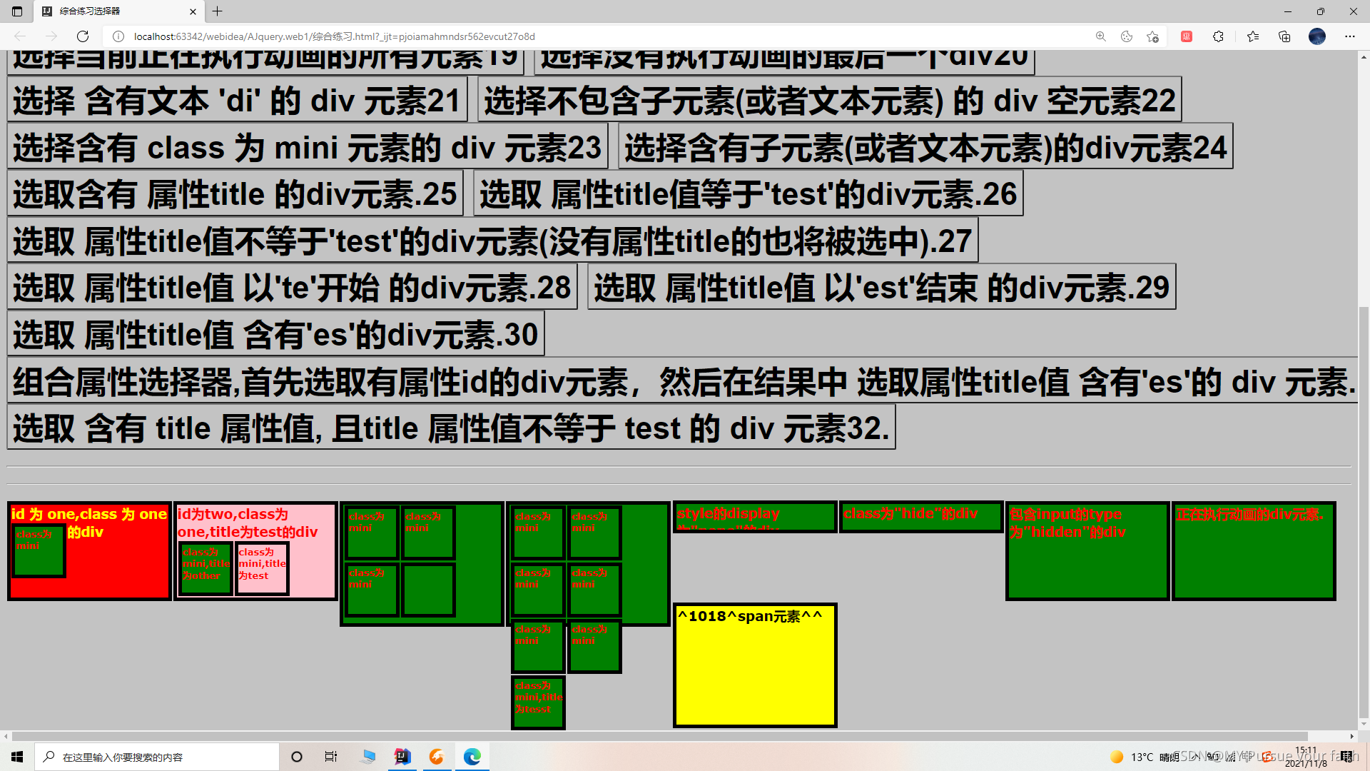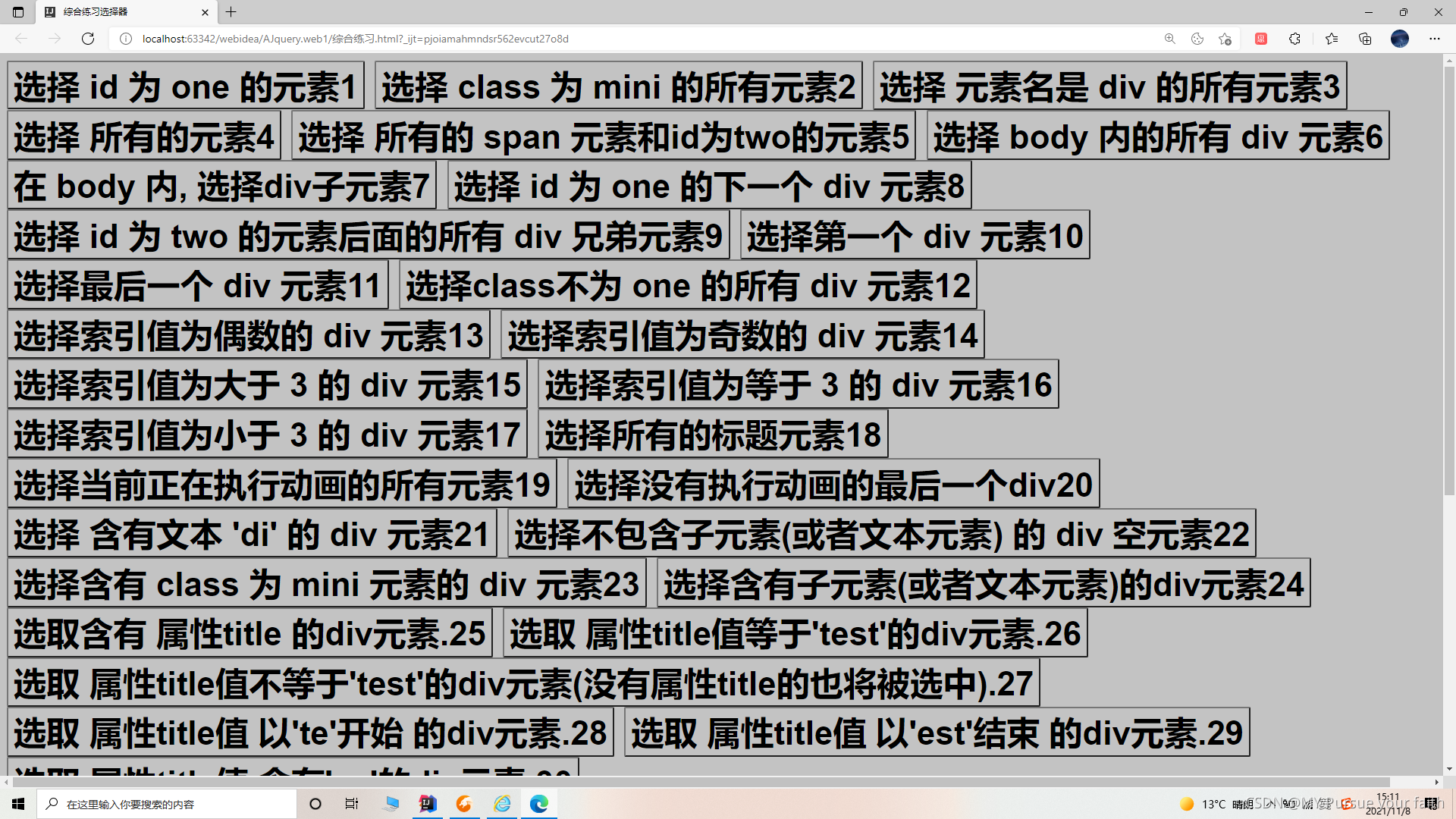 <!DOCTYPE html> <html lang="en"> <head> <meta charset="UTF-8"> <style type="text/css"> div, span, p { width: 200px; height: 150px; margin: 1px; background: yellow; border: #000 5px solid; float: left; font-size: 17px; font-family: Verdana; /* border-radius: 50%;*/ } *{ font-weight: bold; font-size: 40px; } div.mini { width: 60px; height: 60px; background-color: #aaa; font-size: 12px; } div.hide { display: none; } *{ background: #c3c3c3; } </style> <title>综合练习选择器</title> <!--导入jquery文件--> <script src="jquery-3.6.js"></script> <script type="text/javascript"> $(document).ready(function(){ //1.选择 body 内的所有 div 元素 $("#btn1").click(function(){ $("body div").css("background", "pink"); $("body div").css("color", "red"); }); //2.在 body 内, 选择div子元素 $("#btn2").click(function(){ $("body>div").css("background", "yellow"); $("body>div").css("color", "white"); }); //3.选择 id 为 one 的下一个 div 元素 $("#btn3").click(function(){ $("#one+div").css("background", "red"); $("#two+div").css("background", "red"); }); //4.选择 id 为 two 的元素后面的所有 div 兄弟元素 $("#btn4").click(function(){ $("#one~div").css("background", "blue"); }); }); </script> <script type="text/javascript"> $(document).ready(function(){ //1.选择 body 内的所有 div 元素 $("#btn5").click(function(){ $("body div").css("background", "pink"); $("body div").css("color", "red"); }); //2.在 body 内, 选择div子元素 $("#btn6").click(function(){ $("body>div").css("background", "yellow"); $("body>div").css("color", "white"); }); //3.选择 id 为 one 的下一个 div 元素 $("#btn7").click(function(){ $("#one+div").css("background", "red"); $("#two+div").css("background", "red"); }); //4.选择 id 为 two 的元素后面的所有 div 兄弟元素 $("#btn8").click(function(){ $("#one~div").css("background", "blue"); }); }); </script> <script type="text/javascript"> $(document).ready(function(){ function anmateIt(){ $("#mover").slideToggle("slow", anmateIt); } anmateIt(); }); $(document).ready(function(){ //1.选择第一个 div 元素 $("#btn9").click(function(){ $("div:first").css("background", "red"); $("div:first").css("color", "yellow"); }); //2.选择最后一个 div 元素 $("#btn10").click(function(){ $("div:last").css("background", "pink"); $("div:last").css("color", "red"); }); //3.选择class不为 one 的所有 div 元素 $("#btn11").click(function(){ $("div:not(.one)").css("background", "yellow"); }); //4.选择索引值为偶数的 div 元素 $("#btn12").click(function(){ $("div:even").css("background", "#bbffaa"); }); //5.选择索引值为奇数的 div 元素 $("#btn13").click(function(){ $("div:odd").css("background", "purple"); $("div:odd").css("color", "red"); }); //6.选择索引值为大于 3 的 div 元素 $("#btn14").click(function(){ $("div:gt(3)").css("background", "red"); $("div:gt(3)").css("color", "pink"); }); //7.选择索引值为等于 3 的 div 元素 $("#btn15").click(function(){ $("div:eq(3)").css("background", "brown"); }); //8.选择索引值为小于 3 的 div 元素 $("#btn16").click(function(){ $("div:lt(3)").css("background", "green"); }); //9.选择所有的标题元素 $("#btn9").click(function(){ $(":header").css("background", "#bbffaa"); }); //10.选择当前正在执行动画的所有元素 $("#btn17").click(function(){ $(":animated").css("background", "brown"); }); //11.选择没有执行动画的最后一个div $("#btn18").click(function(){ $("div:not(:animated):last").css("background", "#bbffaa"); }); }); </script> <script type="text/javascript"> $(document).ready(function(){ function anmateIt(){ $("#mover").slideToggle("slow", anmateIt); $("#btn1").slideToggle("slow",anmateIt) $("#btn2").slideToggle("slow",anmateIt) $("div:contains('di')").slideToggle("slow",anmateIt) } anmateIt(); }); /** :contains(text) :empty :has(selector) :parent */ $(document).ready(function(){ //1.选择 含有文本 'di' 的 div 元素 $("#btn19").click(function(){ $("div:contains('di')").css("background", "red"); }); //2.选择不包含子元素(或者文本元素) 的 div 空元素 $("#btn20").click(function(){ $("div:empty").css("background", "pink"); }); //3.选择含有 class 为 mini 元素的 div 元素 $("#btn21").click(function(){ $("div:has('.mini')").css("background", "gray"); }); //4.选择含有子元素(或者文本元素)的div元素 $("#btn22").click(function(){ $("div:parent").css("background", "orange"); }); }); </script> <script type="text/javascript"> $(document).ready(function(){ function anmateIt(){ $("#mover").slideToggle("slow", anmateIt); } anmateIt(); }); /** :hidden :visible */ $(document).ready(function(){ //1.选取所有可见的 div 元素 $("#btn23").click(function(){ $("div:visible").css("background", "pink"); }); //2.选择所有不可见的 div 元素 //不可见:display属性设置为none,或visible设置为hidden $("#btn24").click(function(){ $("div:hidden").show("slow").css("background", "yellow"); $("div:hidden").show("slow").css("color", "red"); }); //3.选择所有不可见的 input 元素 $("#btn25").click(function(){ alert($("input:hidden").attr("value")); }); }); </script> <script type="text/javascript"> /** [attribute] [attribute=value] [attribute!=value] [attribute^=value] [attribute$=value] [attribute*=value] [attrSel1][attrSel2][attrSelN] */ $(function() { //1.选取含有 属性title 的div元素 $("#btn26").click(function() { $("div[title]").css("background", "pink"); }); //2.选取 属性title值等于'test'的div元素 $("#btn27").click(function() { $("div[title='test']").css("background", "red"); }); //3.选取 属性title值不等于'test'的div元素(*没有属性title的也将被选中) $("#btn28").click(function() { $("div[title!='test']").css("background", "green"); }); //4.选取 属性title值 以'te'开始 的div元素 $("#btn29").click(function() { $("div[title^='te']").css("background", "yellow"); }); //5.选取 属性title值 以'est'结束 的div元素 $("#btn30").click(f